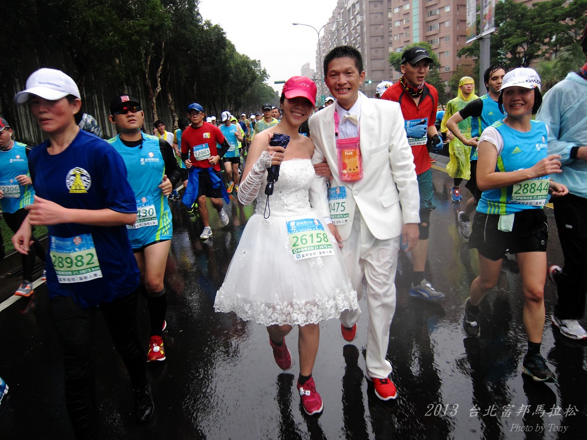 前一天看著天氣預報,心又涼了一截...降雨機率高達90%..Orz 上次太馬已淋了二個小時,我看這次又差不多了XDD 一早來到W和大家集合 因為起床太晚,只得匆匆吃了二個巧克力餅干就準備往市政府集合出發!! 又糊塗的忘了帶一包能量包,只好先和外星人小頡先借一包來放!! 雖然天空下著毛毛雨,但心情卻是熱的... 人也多到爆,擠了13分鐘才出計時拱門,一開始出發的選手都已跑到圓環去了~~XDD 且~~才出發就和大家擠散... 好吧~就慢慢跑吧~ 出發時二旁不乏加油的民眾,先來拍幾張~ 跑個1K~右邊出現了熟悉的聲音~(NATSUMI的笑聲~~) YA~~居然遇上NATSUMI了~ 趕緊過去和大家集合拍個照!! 然後路邊再拍個二張之後...大家又不見了XDD 好吧~遲早是要分開的,就按自己的節奏跑吧~ 不過要按自己的節奏也很難啦,路雖然大條,但人太多,尤其我幾乎又是最後出發的,6分速就得一路超車了XDD 且加油的民眾有時在左邊,有時在右邊,要切來切去有時還有點辛苦啊!! 像是中山北路幾位辣妹,我就是來不及切..跑過頭再繞回去拍的XD 反正....專心跑,和拍照跑,頂多也差個10分鐘而已,快個10分鐘,排名一樣很後面,慢個10分鐘卻多了這麼多可以回憶的照片,我想...這是值得的吧:P 就這樣...一邊跑一邊拍,在下新生高架橋時,居然也被國棟給追上了,看來最近二次每次二小時的LSD特訓真的有用,抽筋棟終於要一雪前恥了~ 跑到忠烈祠前大約11公里,在這的補給站把能量包給吃掉,再喝個半杯舒跑後,繼續向前挺進!! 不過~~就在自己身體覺得愈跑愈順時..,左小腿突然傳來一點點刺痛...Orz 按之前的經驗,我知道我的腓腸肌又出問題了~~ 上週自己用5分半的速度練跑近15k都沒事,怎麼這次在13-14k就出現問題?? 我想..可能是上週的疲勞還沒結束,週三練跑時,好像又稍微有拉到~ 雖然經過三天的休息已沒什麼感覺了,但終究在13-14k後就顯現出來了!! 我看似粗壯的蘿蔔怎麼會這麼弱啊XDDD 路程都已跑一半了,就繼續跑吧~ 降點速讓爆掉的時間延緩大爆發發作!! 就這樣撐到環快上面,雖然只剩2-3KM,但看見補給站還是去喝個水,喝個餅干和香蕉 再到護理站去噴個肌樂!! 沒多久就看到全馬的前導車從後方開過來了 哇塞,第一名回來了,肯亞的喬瑟法·傑可波(Josphat Kamzee Jepkopol)從我身邊飛快的跑過,超強的啦~~ 最後出了基隆路的地下道,只剩最後1KM,大家也都加速了起來,突然被一個小個頭女生刷卡而過,又激起我的鬥志,雖然蘿蔔痛,但還是要看一下刷我卡的是那位女生,努力的用5分速跟上去,只敢拍個背影,不好意思拍正面...XDD,最後200公尺,她再度加速...,我為了要拍照,只好目送她遠離XDD!! 這次成續2:09"15,比太馬退步了一點點~ 我想..照片拍的比較多一些,再加上蘿蔔痛是最大的主因~ 不過這成績我是覺得還可以了啦,蘿蔔痛才是我在意的~(經過一天的休息、冰敷、上小腿套再貼上撒隆適布後,情況已好轉很多~) 未來~我看~得多加強我的蘿蔔訓練才行!! 這次台北富邦,本想希望看能不能請老婆帶著兩隻小鬼來終點幫我加油~ 但這雨實在太大~~ 只好看看下次有沒有機會了!! ^__^ 距離: 22.22 公里 時間: 2:09:15 平均步速: 5:49 分鐘/公里 平均心率: 162 bpm Avg Run Cadence: 180 spm Avg Vertical Oscillation: 7.3 公分 Avg Ground Contact Time: 245 毫秒 Avg Stride Length: 0.95 公尺 衣保袋一個100元,很大,可以裝很多東西,不過不防水,這種天氣自己的乾衣服要用塑膠袋再包起來!! 為了富邦馬,第一次搭信義線捷運!! 捷運提早發車,許多人都搭捷運來市政府前集合!! Go Fun 準備集合出發了!! 原諒我的小相機在燈光不足下的效果實在....Orz GOGOGO~~(KT你終於出現在我的相機裡了!!) 我們還沒出發,前面的己經跑到仁愛路圓環了!! GO~出發!!(大家都不見了XD) 後面的無臉人是怎麼回事XDD YA~~撿回Go Fun隊員--林庭瑄 這次進步超多的果凍~ 撐到9K還是ITB的WES~XDD 賽完以為自己破PB的NATSUMI~:P 看到相機就瘋了的大家XDD 讚讚讚~~有觀眾加油真的跑起來比較有力!! (這裡才不到3K~當然很有力~:P) 也有視障者加入,毅力讓人佩服!! 加油~加油~ 加油~加油~ 斯巴達出現了~ 空姐出現了~~ 熱情的民眾~ 格格也在總統府圓環出現了~~:P 就是這幾位辣妹~讓我沒破PB的~ 阿姨加油~辛苦了!! (晴天的話很想多拍台北市風景,但下雨一片霧茫茫..只好多拍加油的民眾!!) 全馬半馬在這裡要分開了(分開後..人還是一樣多XDD) 雖然下雨,但還是滿滿的人潮!! 經過忠烈祠了!! 白蘭氏這幾位加油的美眉真可愛^O^ 這二位穿著白西裝和小禮服來跑步,好猛啊!! 要上快速道路了!! 折返點到了!!終點不遠了! 半馬靠內跑,因為...第一名要來了!! 第一名回來了,肯亞的喬瑟法·傑可波(Josphat Kamzee Jepkopol)從我身邊飛快跑過,超猛!!一下子就不見了~~ 大家幹嘛這麼HIGH~ 因為地下道上頭有攝影師啦!! 就是這位妹妹,最後1K把我刷卡了XDD 終點到了!!終點到了!! 2小時23分抵達!! 我的眼鏡起霧了!! (難怪一片霧茫茫 XDD) 排隊領毛巾和獎牌!! 跑的時侯不會冷,一停下來就覺得冷了! 大家紛紛把大毛巾給披上!! 我的晶片沒有去退還,就捐給罕見疾病基金會了!! 獎牌的質感還不錯~(但我拍的背面去了XD) 坐在角落竊笑的小花 恭喜林庭瑄完賽 Go Fun大集合~ 回家前撿到外星人小頡,以3:39完賽,真是太強大了!! -------------------------------------------