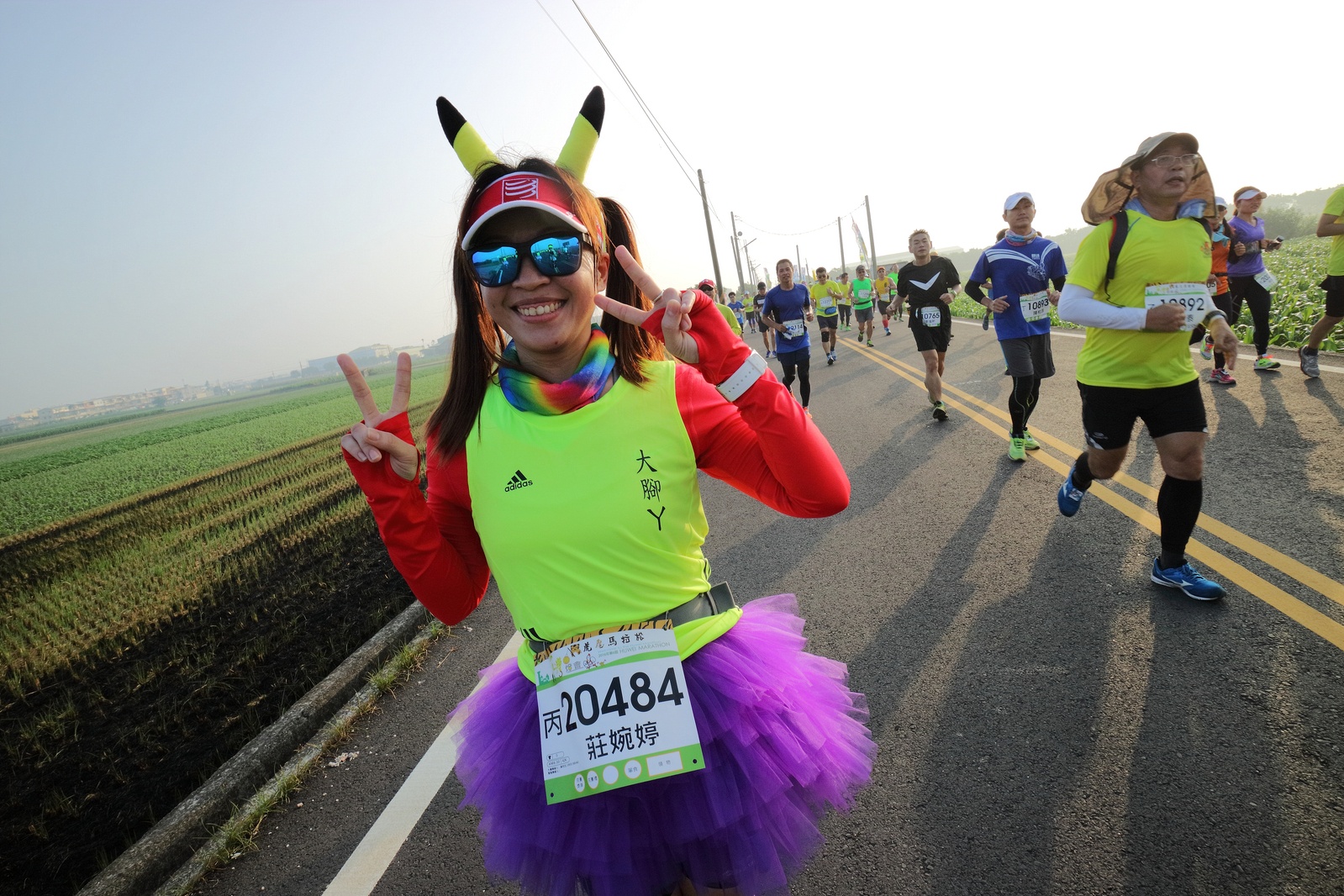 雲林的馬拉松還沒來跑過 阿貝說好玩,就跟著來了~ 不過這次虎尾馬的路線有改,除了一開始還有跑在田邊 後來幾乎都是小鎮裡,就有點小無聊~ 因為天氣好,大家怕熱,所以一開始阿貝、姐夫和RS都先跑出去了.. 我心想不急,先陪先陪阿寄慢慢跑個5K 才7分多速,阿寄就說他有點喘XDD 可能我陪在旁邊,阿寄覺得壓力大 3K後就催促我趕快往前跑,不要等她~ 所以3K後我就恢復自己正常5:30上下的速度前進 不過人好多..,心想不知遇不遇的到其它人~ 沒想到在第2還第3個水站居然看到阿貝~ 那就跟著阿貝跑吧~ 阿貝說看看能不能在2"20分以內跑完 23K要跑2"20分,那大概就是5分尾.. 阿貝直說今天心跳一直拉不起來,心跳比我還低 不得不說最近阿貝練的頗勤勞,實力已提升非常多 不過二個邊跑邊玩,後面的補給站都努力的吃喝玩樂,耗了不少時間~,太陽愈來愈大,阿貝直說幸好有先跑,不然會熱死XDD 最後2K,阿貝叫我先走,我很聽話的就用5分初的速度跑出去了 不過回頭一看,阿貝也沒在身後沒多遠..,我就頭也不回的努力往前跑 最後300公尺,聽到後面有卻步聲上來 想說..這成績,應該很少人會有這種速度 回頭一看,居然是阿貝啊~ 媽呀,阿貝比我晚起步,我又都跑5分初~ 居然追上來,真是太可怕了 最後50公尺,還和我說不衝刺要超過我了 害我也得卯起來跑~ 二人最後同時衝線~ 哈哈~好險好險~ 不過,因為起跑時我站在後面幫大家拍照 所以個人成績小贏2秒:P 隨後姐夫,RS和阿寄也陸續回來 大家都成功完賽.. 成績嘛... 就不要太在意,好玩就好:P