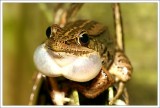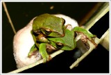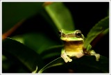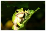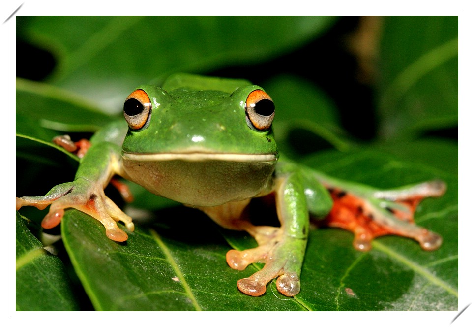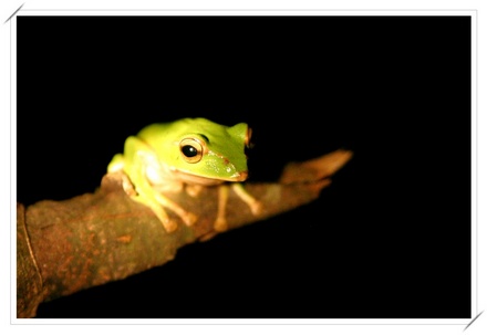 我想很多人都看過一張在網路上流傳的青蛙照片,照片是有一隻綠色青蛙拿著樹葉遮雨的樣子!!看過這張照片無人不莞爾一笑。除了這張照片之外 ,我還有在dcview上看到許多可愛的青蛙照片讓我很想要嚐試這方面的生態攝影。在一次偶然的機會裡一位愛蛙的朋友--Hoher要上台北來觀察翡翠樹蛙,這種大好的機會當然不能放過,就厚著臉皮要他讓我跟著去賞蛙,也拍攝了我的第一張青蛙照。就此就開啟啟我的青蛙生態攝影!! |