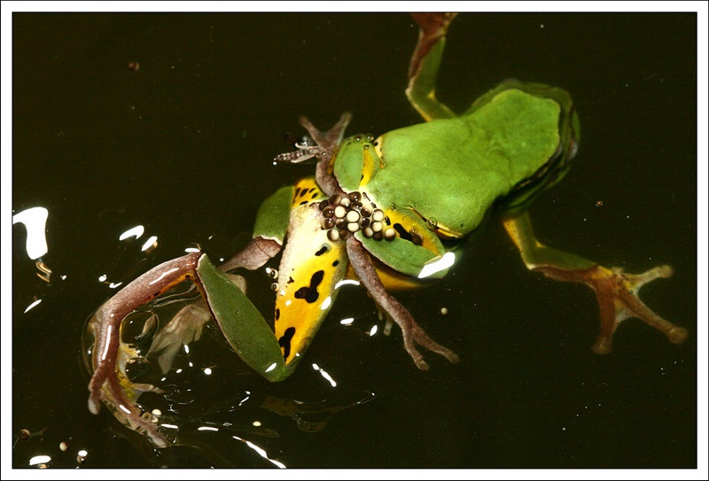 果然沒多久,看著母蛙背著公蛙對著水裡望著,我想應該是要發動下一波了吧,果然噗通一聲就下水產卵了。拿起相機就卡嚓卡嚓猛拍,可惜裝了柔光罩的閃燈出力都會搞錯,照片大多一片黑,幸好是拍RAW檔才把照片救回來^++++^。