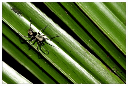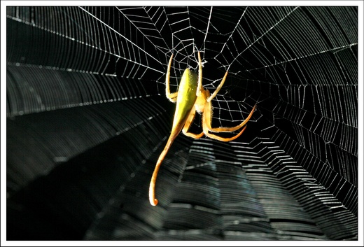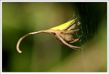 枯葉尖鼻蛛,這隻蜘蛛長很奇特,帶著一把長長的柄,我想可能是要吸引獵物的吧,一受到驚嚇後原本張著開開的腳就會縮起來,就像一片葉子黏在蜘蛛網上,真的非常有趣,而當時本來覺得是曳尾蛛,回來經hoher貼到論壇,大家比對圖鍵後,認為這個是枯葉尖鼻蛛。 |