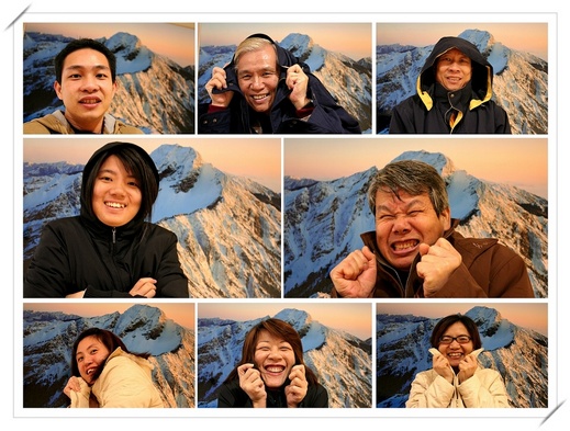 一月底我們一起到望鄉部落過年,我建議大家到玉山登山口走走,可是到了排雲管理站,大雨就下個不停,大家只好作罷,看著管理站裡擺放的玉山照片,我眼中忽然一亮,叫大家都來張大頭照吧,而且規定還要裝的很冷的樣子,看著照片裡的每個人都努力裝出很冷的樣子,真是可愛極了啊....哈哈哈。 |