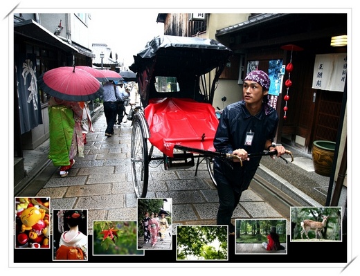 這是今年去京都自助旅行的照片,很喜歡這張照片,拉著人力車的帥氣年輕人加上扮藝妓美眉的背影(若沒有那二個路人甲的背影會更好=.="),讓我當時馬上就抓起相機就拍,感覺就像時光回溯了,而我凍結了這一個畫面..(自我陶醉中~~~^^) |
