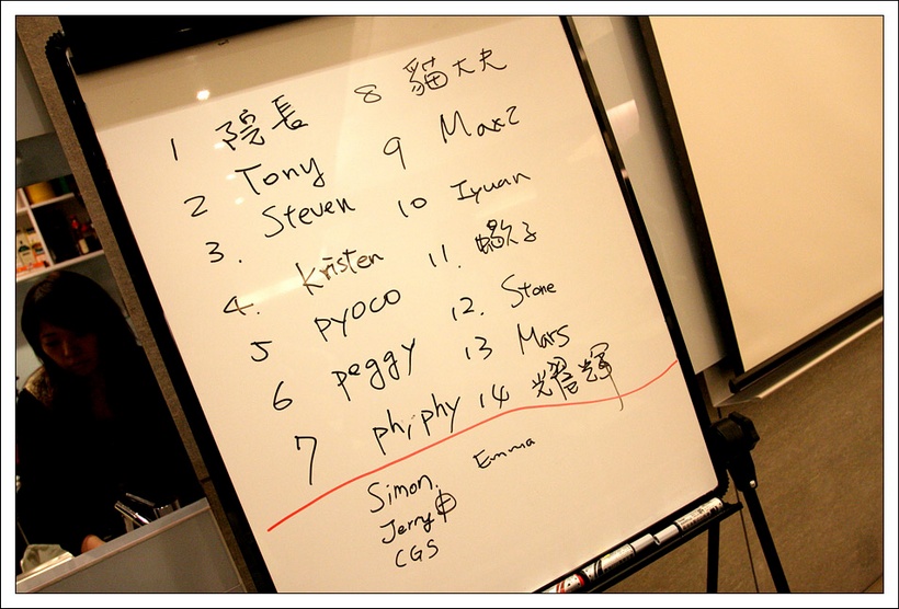 上面這張白板寫的是今天的分享順序,所以看的出來今天的人數相當的多,
