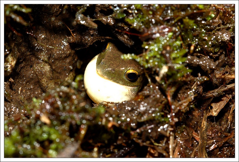 而台北樹蛙一般的習性不是這樣,大多都是躲在土裡叫,所以可以聽到牠們的叫聲卻看不到牠們的身影,努力的趴近地面就可以聽到牠們響亮的叫聲從土裡傳過來,上面這張就是我自己慢慢將土挖開後就發現這隻小土豆躲在洞裡,當然那時受到干擾的牠就不會鳴叫了,只好先到附近去觀察其它台北樹蛙,等了很久,這隻台北樹蛙終於放下心防覺得安全之後又開始吹泡泡,趕緊過去拍下這張在土裡的泡泡,WINSUN說這樣的照片算是相當難得的,因為要開挖而不甘擾到牠就要很好的運氣,不然常常是挖到了,牠也因受到驚嚇而跳了出來。