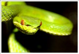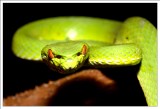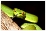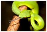 這天天氣有些寒冷,但我們在山壁上還是發現了一隻赤尾青竹絲,有了HOHER在一旁勇氣加持,這次就大膽的靠近拍攝牠,說真的,赤尾青竹絲的臉孔還真不是普通的兇狠呢,雖然他們說很安全很安全,但在拍攝時心裡還是不免毛毛的。 講到這不免說一下當天老婆也有去,因為要使青竹絲吐信,hoher不是使出吹氣大法就是用蛇勾輕輕觸碰蛇的尾巴,看著看著老婆忽然說想要用手摸摸看,哇咧,老婆你的膽子未免太大了點,在我極力反對之下,老婆才沒去摸=.="