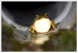 12/30 由winsun帶路和hoher一起到三芝尋找可愛的台北樹蛙,為什麼要到三芝去,不僅是因為三芝的環境比較潮溼,另外一點就是在山壁上有些排水孔,台北樹蛙會躲在裡鳴叫,比較容易觀察,不過要拍攝排水孔內的台北樹蛙的泡泡也不是那麼容易,第一得用長鏡頭加上腳架,不然加在機頂的閃燈會打不進排水孔內,不然就得用離閃,再來是手動對好焦後,就要將手電筒關掉,因為樹蛙大多很怕干擾,在有光的情況下幾乎是不大會叫的,然後靜待牠鳴叫的時後趕緊按下快門,首頁這張就是這樣拍下的,黑暗中還可以補捉到快撐破的泡泡,運氣算是相當相當好的!!^O^