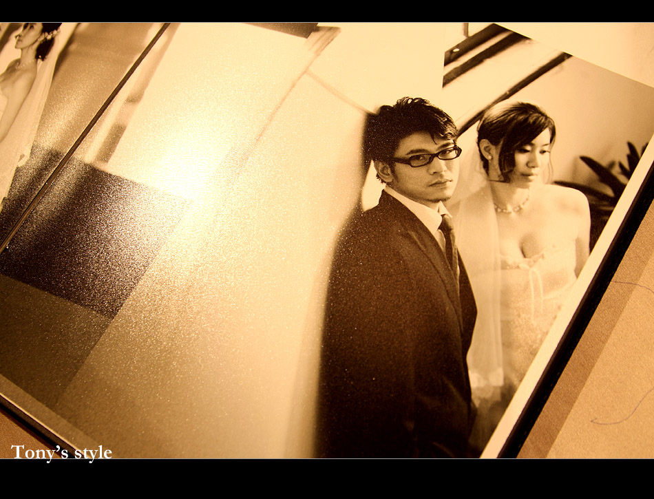 Kelly是我公司的同事,因為她有聽說我喜歡攝影所以在喜宴前就讓我看看她的「風格」婚紗照,這本婚紗照全看不出什麼幸福快樂,二個人的表情都好像被倒了八佰萬的會= =",不過她強調這都出自他老公的想法...(把錯全推到老公身上就是了..),反正就是不喜歡制式的沙龍照就對了...,除了看著看著才發現原來我這同事「身裁」超好..,平常上班的制服真是完全看不出來,本來是不想參加她的喜宴了,但她說當天會有超低胸(前叉開到近肚臍)的禮服,衝著這一點我只好交了門票...(但前一天她說婚紗公司怕太露就把衣服縫起來的,我完全覺得是片面之詞」...