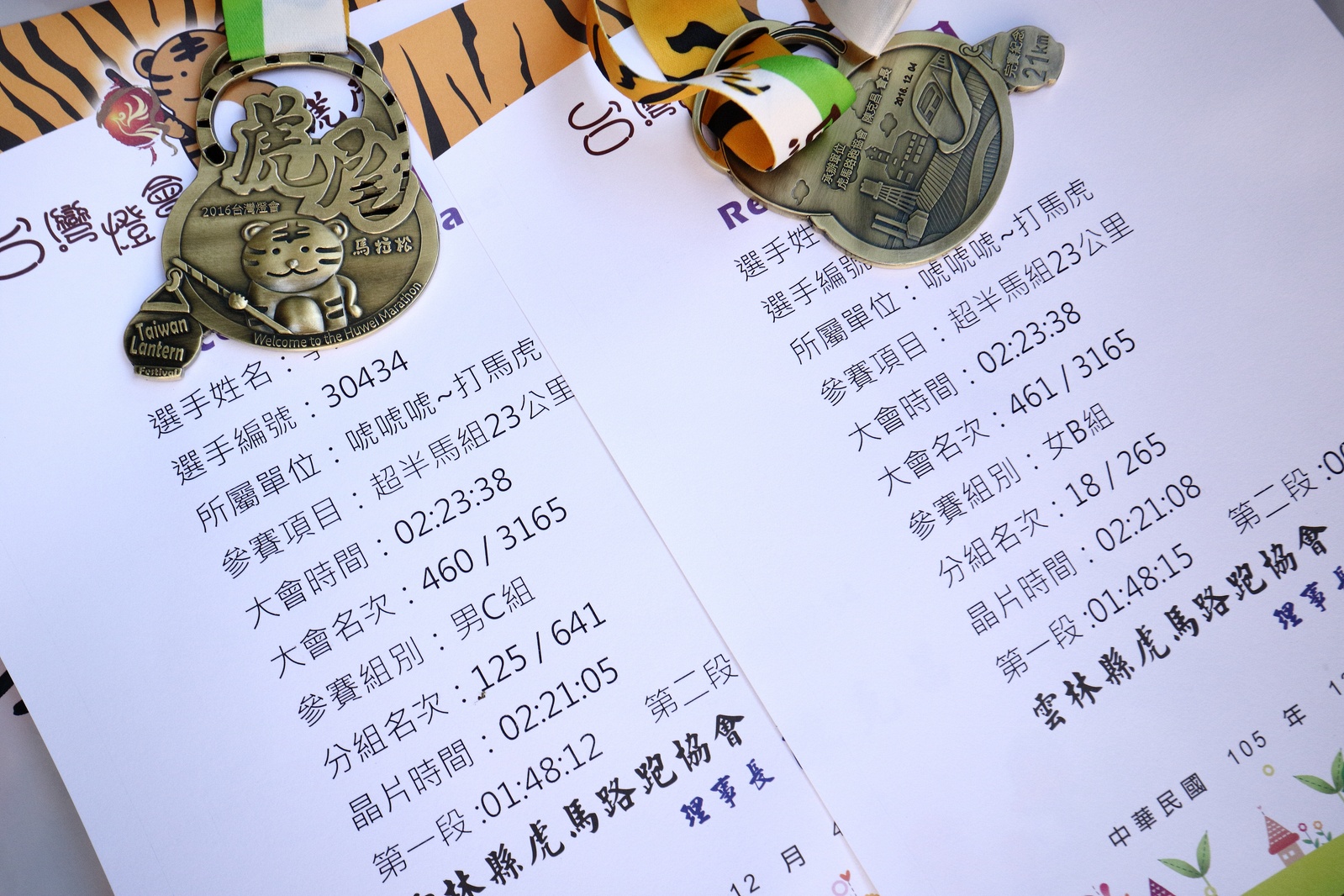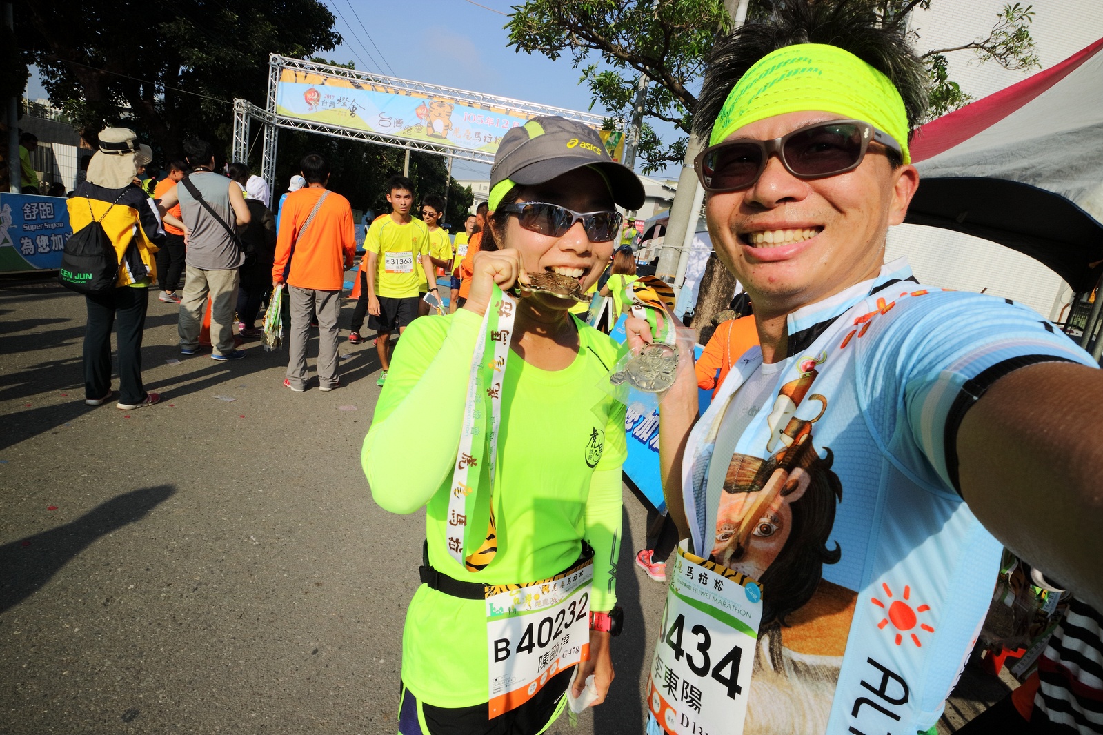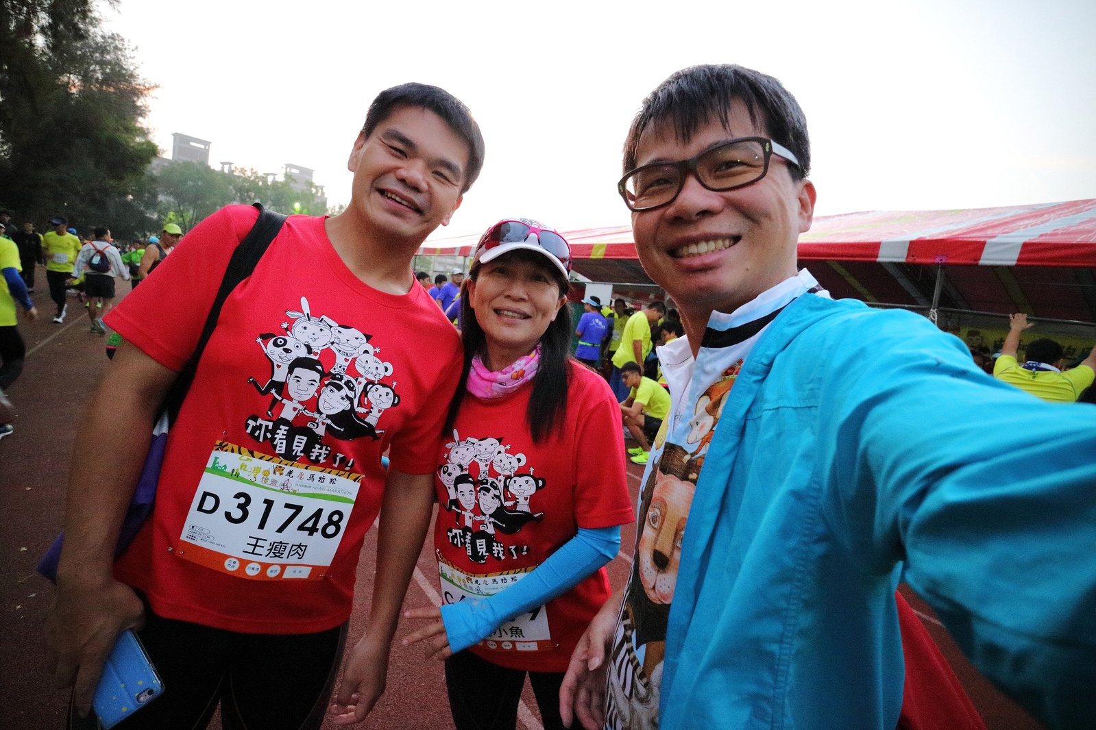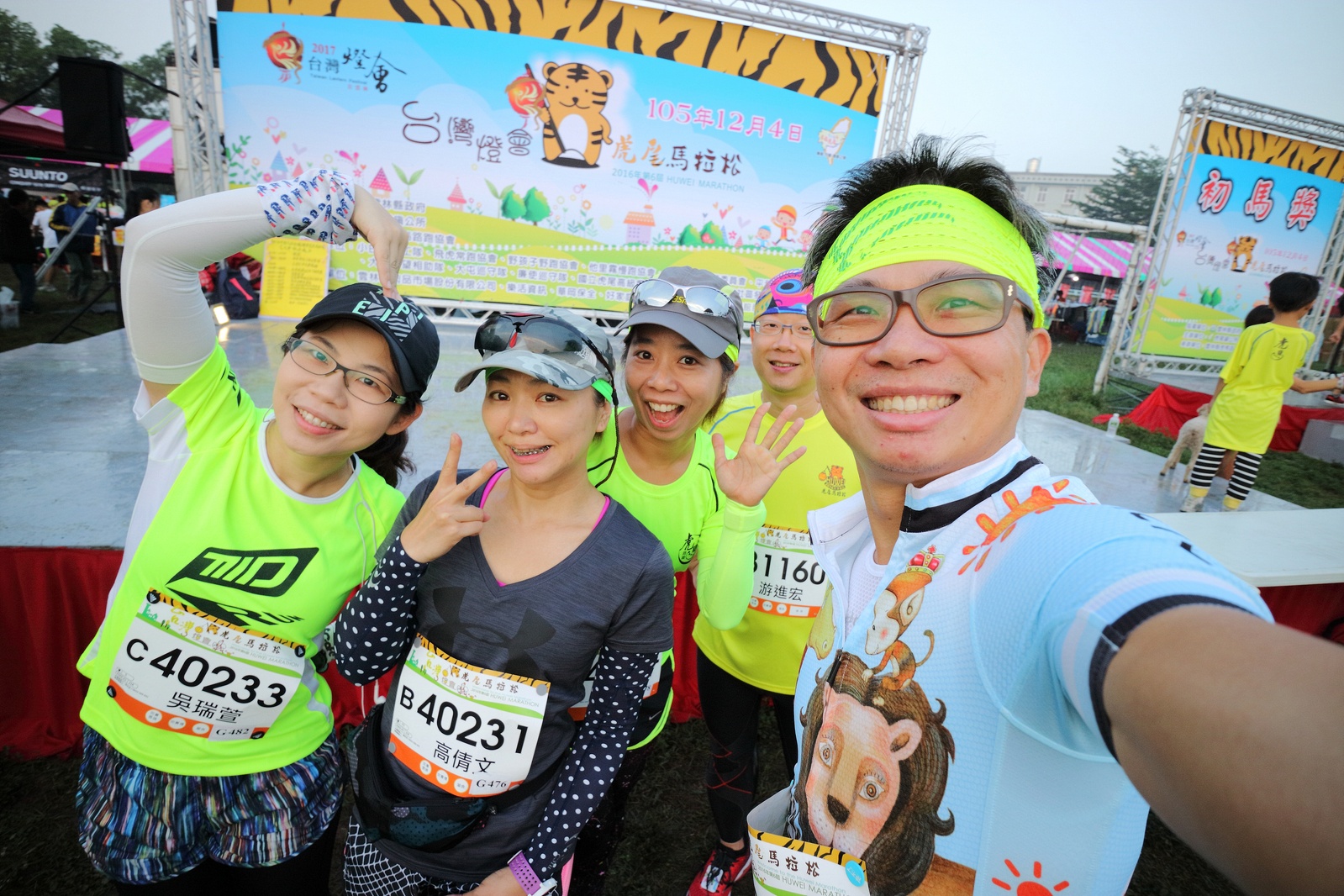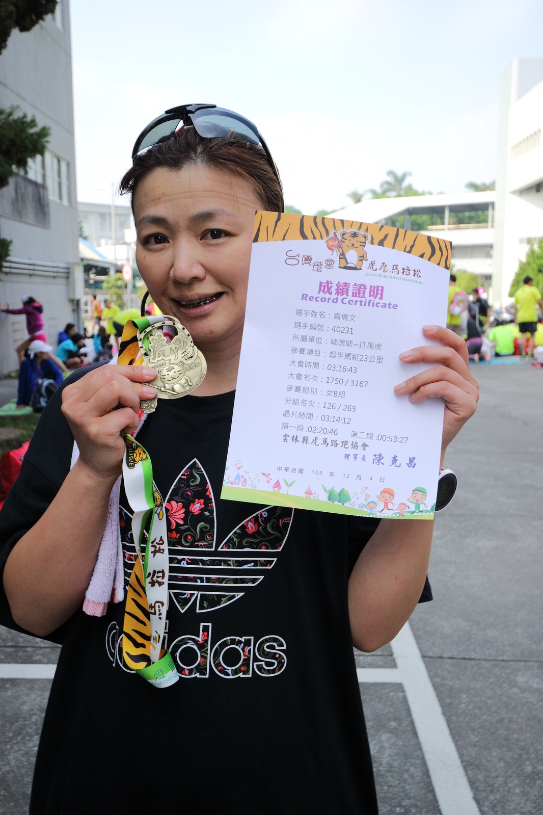 雲林的馬拉松還沒來跑過 阿貝說好玩,就跟著來了~ 不過這次虎尾馬的路線有改,除了一開始還有跑在田邊 後來幾乎都是小鎮裡,就有點小無聊~ 因為天氣好,大家怕熱,所以一開始阿貝、姐夫和RS都先跑出去了.. 我心想不急,先陪先陪阿寄慢慢跑個5K 才7分多速,阿寄就說他有點喘XDD 可能我陪在旁邊,阿寄覺得壓力大 3K後就催促我趕快往前跑,不要等她~ 所以3K後我就恢復自己正常5:30上下的速度前進 不過人好多..,心想不知遇不遇的到其它人~ 沒想到在第2還第3個水站居然看到阿貝~ 那就跟著阿貝跑吧~ 阿貝說看看能不能在2"20分以內跑完 23K要跑2"20分,那大概就是5分尾.. 阿貝直說今天心跳一直拉不起來,心跳比我還低 不得不說最近阿貝練的頗勤勞,實力已提升非常多 不過二個邊跑邊玩,後面的補給站都努力的吃喝玩樂,耗了不少時間~,太陽愈來愈大,阿貝直說幸好有先跑,不然會熱死XDD 最後2K,阿貝叫我先走,我很聽話的就用5分初的速度跑出去了 不過回頭一看,阿貝也沒在身後沒多遠..,我就頭也不回的努力往前跑 最後300公尺,聽到後面有卻步聲上來 想說..這成績,應該很少人會有這種速度 回頭一看,居然是阿貝啊~ 媽呀,阿貝比我晚起步,我又都跑5分初~ 居然追上來,真是太可怕了 最後50公尺,還和我說不衝刺要超過我了 害我也得卯起來跑~ 二人最後同時衝線~ 哈哈~好險好險~ 不過,因為起跑時我站在後面幫大家拍照 所以個人成績小贏2秒:P 隨後姐夫,RS和阿寄也陸續回來 大家都成功完賽.. 成績嘛... 就不要太在意,好玩就好:P