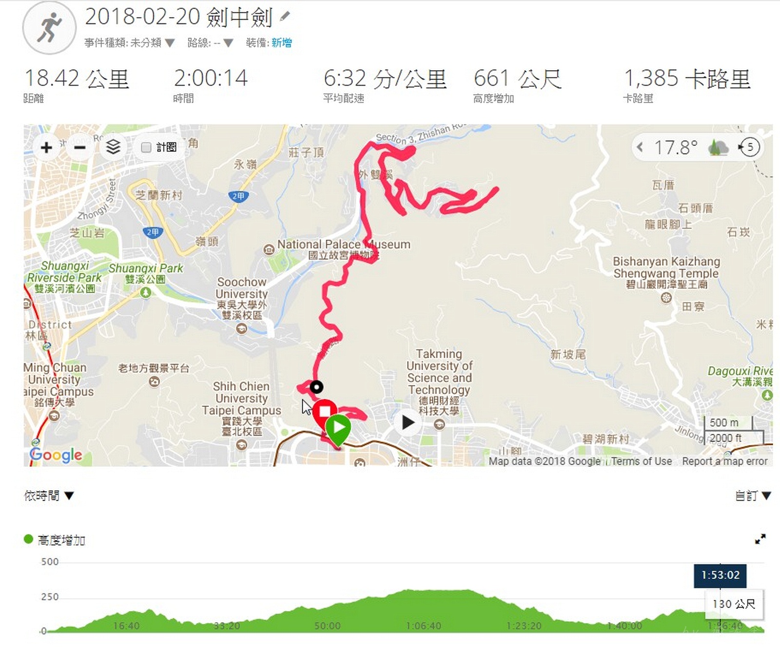 筱嵐姐揪了很多次的劍中劍~ 一直都沒去跑~ 過年前偷懶了很久,不知那根筋不對 居然也說要+1 一早6點就在劍南站集合 這次還和藍鳥隊的朋友一起跑,天還黑黑的一起出發,跑在後面覺得還挺壯觀的~ 久沒跑,上坡很喘..,原以為到頂會小休一下,沒想到前面的高手都繼續跑,我們也只跟著下去... 跑跑跑,我和健榮看到一個藍鳥隊的年輕女生,想說等等是不是可以追上了.. 沒想到一上坡馬上又不見人影,後來才知道人家是半馬SUB140的高手XDDD STAR說今天跑到中社的警察局就好,一上中社就不見二個人身影,喘的到死,只能按自己的節奏跑,到了警察局,人咧??人咧??靠夭,又騙人..要回頭嗎??筱嵐和燕子姐都還在後面,她們也一定會上到中社頂,那就慢慢龜吧...= =" 好不容易到了中社頂,呼~~回程"只"剩一個劍南坡,記得上次跑全鴨時,不陡也不長...,但這次跑起來怎麼覺得又臭又長啊,心跳都飆死180多,時間居然和上次LSD的團練一樣..,果然退步很多 最後終於在2小時完成來回.. 心得嘛..終於完成了劍中劍,坡度算是..不會太陡太長,若腿力許可下,來練這18K還不錯,不然我覺得故宮--中社--聖人瀑布來回也不錯..有機會可以再來練練:P