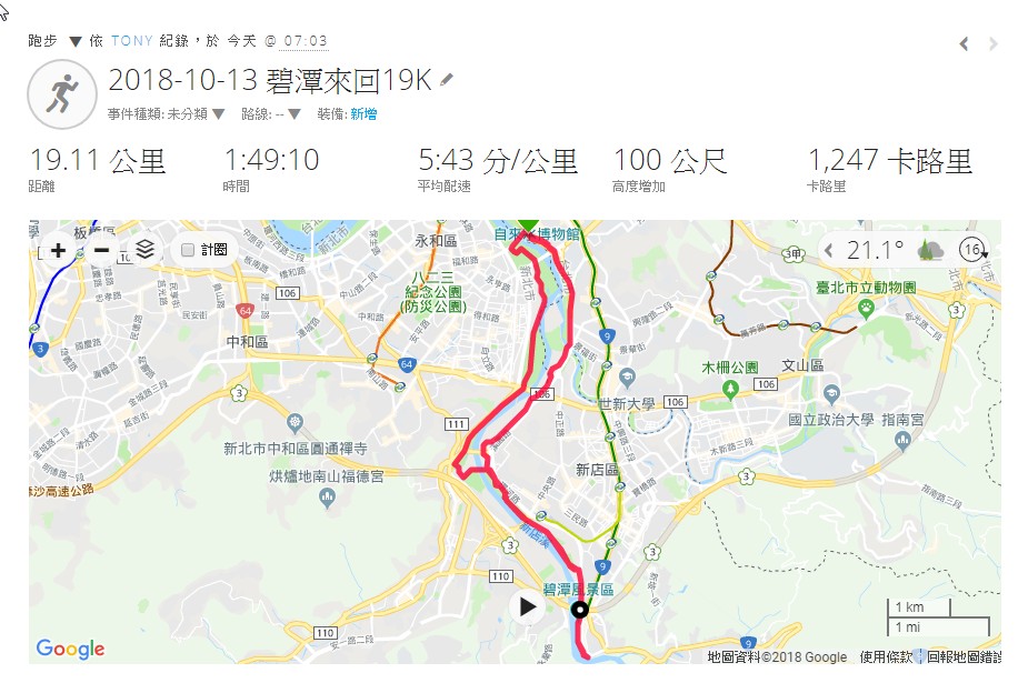 喔耶!!達到森林跑站門檻可以來抽東京馬了!!!! ---------------------------------------------- 今早很榮幸去程由二位波馬辣姐 周筱嵐 黃淑燕 一路陪跑到碧潭~,有辣姐陪跑的時光過的真的很快,跑著跑著就到碧潭了~ 回程想加碼到19K~就往左繞過陽光橋~ 跑了沒多久看到前方有視障跑者 -- 火哥,然後前方有二位精實跑者,看那身高、身裁、小腿強壯度和跑步的氣勢,87%猜測是總排MO Molly Lu~ 使出吃奶的力氣跟上去,我猜的沒錯,果然是總排MO~總排MO笑著跑步,我卻喘著要死,好險我再2-3K就到永福橋就可以下車,不然繼續跟下去,我應該會倒在路邊被撿屍~XDD 好久沒跑這麼長的距離了~ 我想應該要好好休個三天了:P