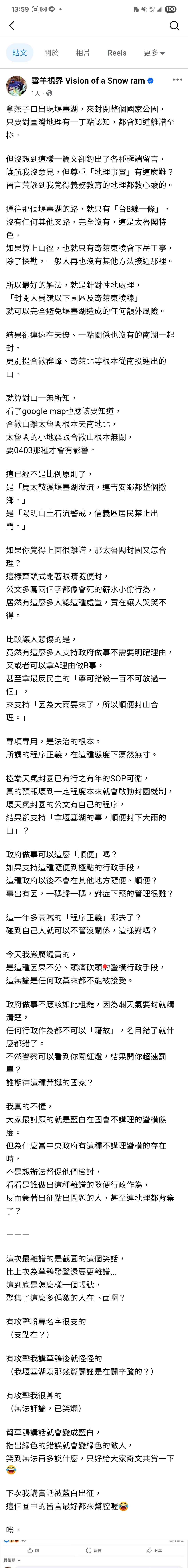 其實我剛看的時候也覺得為了燕子口的堰塞湖封閉整個太魯閣國家公園,政策是否洽當??雪羊的說法有他的思路及邏輯