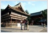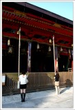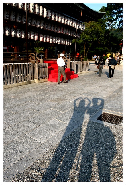 | 祇園的對面就是八阪神社,是京都少數幾個不用門票的廟,台灣在日本殖民時代也建了許多大大小小的神社,可是在政治因素的考量下幾乎所以的神社都被拆毀,目前桃園忠列祠算是保存的最好的一個,其它還有金瓜石的黃金神社、圓山的水神社、花蓮新城的天主教堂及花蓮市的慶修院。今天就站在日本神社前,那種感覺還真是有點熟悉,不過神社前長長的繩子上掛著祈願的鈴噹和滿滿的紙燈籠都是台灣所沒有的。 |