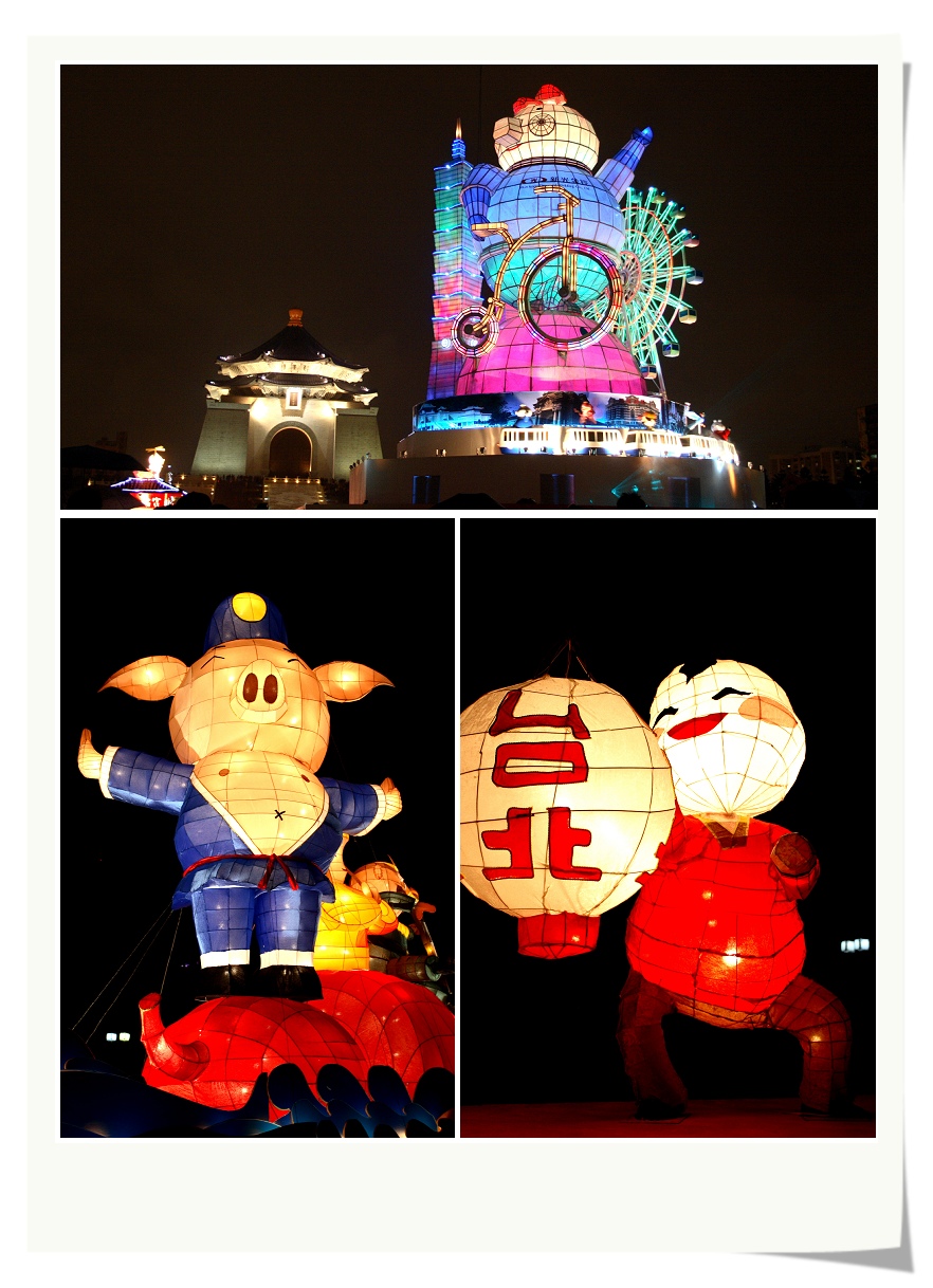 3/11 趁著台北花燈的最後一天來到中正紀念堂欣賞花燈,這次主要是衝著可愛主燈的朱古力來的,以往的的主燈都比較「藝術」一些,今年的朱古力可是花俏許多,而且還搭配著台北101、美麗華摩天輪和新光三越大樓,把台北重要的大地標都搬上抬面了。