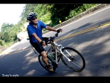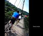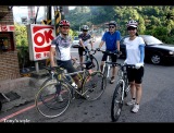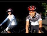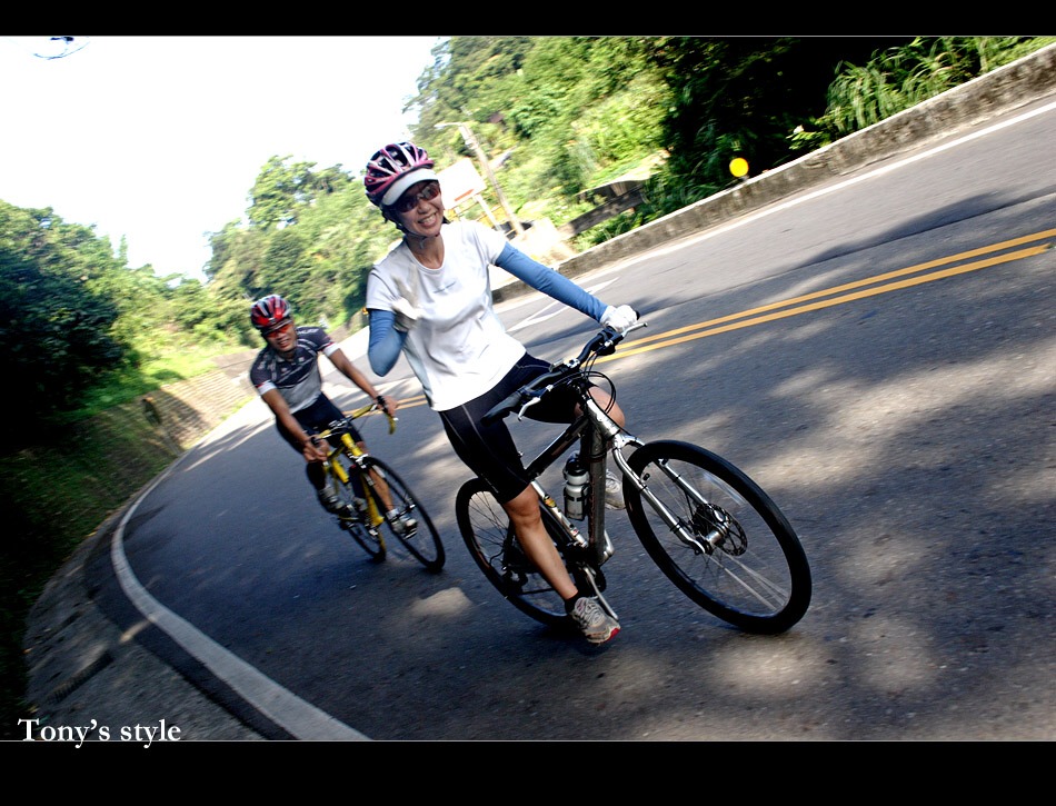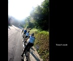 隔天一早6:00至新店集合,monet沒來...而peter睡過頭才剛起床,昱瑋帶著老婆和弟弟(超強的爬坡王)來,再加上我和stoen,看這情形,今天應該是走輕鬆路線,心中就開始暗自竊喜.... 從石碇的ok便利商店左回轉之後就開始一路緩上坡,stone一開始就戰力十足的領先,,因經過前三個星期的操練,這次我就可以緊緊的跟住他,因坡度不陡,我們也沒趕時間,我和stone就決定先停在路邊把相機拿出來邊騎邊拍照,不過就在相機還沒準備好時,昱瑋已帶著他老婆悠哉的騎了過來,而之後這一路就是這樣,偶爾我們會稍微快一些,但只要稍稍鬆懈,昱偉嫂馬上就從後方趕上來,真是太可怕了=.=" 騎到半路昱瑋就說今天不騎到瑞芳去,只到平溪或十分就好,哈哈∼∼這真是個令人開心的好消息,不過對stone而言就不是了,「這樣今天就無法破百了耶」他略微沮喪的說,「若騎不到一百,下山之後你再去多繞繞河濱就好了!!」懶惰的我趕緊和他這樣說,聽昱瑋說從十分到瑞芳雖然只有十公理,但那一段是最陡的,我心理直呼好險,不然我今天鐵定又得喘須須了。 回程下坡時遇到一個嚇死人的小插曲,因為要減低風阻,在騎車時我都會緊緊跟住前面的隊友來減輕風阻,但遇到一台超白目的賓士轎車在公路上狂飆,還高速的逆向行駛,當我前方的隊友peter發現時趕緊剎車,而我也隨即跟著剎車,但還是衝到peter旁,變成併排的現象,但GY的賓士車對著我們衝過來且毫無減速的感覺,我只好往PETER靠過去,緊張的我不小心就把腳卡到他後輪,害他差點去撞到一旁的護欄,真是嚇死我了,到現在回想起來還是滿腔不爽,咀咒那台賓士早日撞山壁不然飛下海也可以,真是太GY了...凸凸凸 嗯∼∼驚險過後好像也沒什麼好寫了,於11點就平安到家!!PEACE∼∼