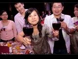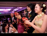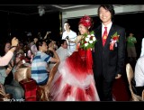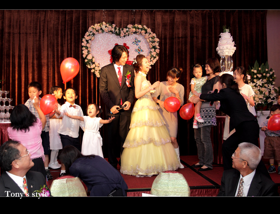 這天的最高潮出現在小猴正妹第二次進場時,她一個人拿著麥克風唱著不流利的「愛情限時批」進場,而她老公--小輔也從另一頭拿著麥克風,背後藏著一大束玫瑰花出現,當二個人接近時,小輔單跪著拿出鮮花,在眾人的注目之下補償欠她的求婚儀式,小猴正妹緊緊的抱著小猴,然後當場情不自禁的熱情擁吻,讓當場的氣氛HIGH到最高點..(看的我好想哭,可是新娘都不哭了,攝影師哭什麼>"<)