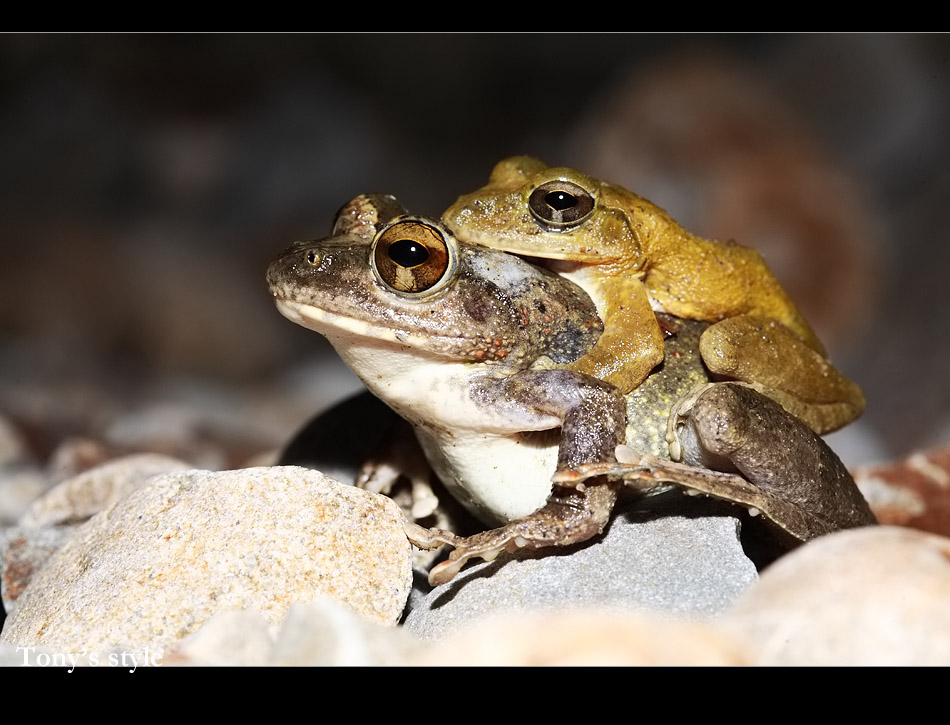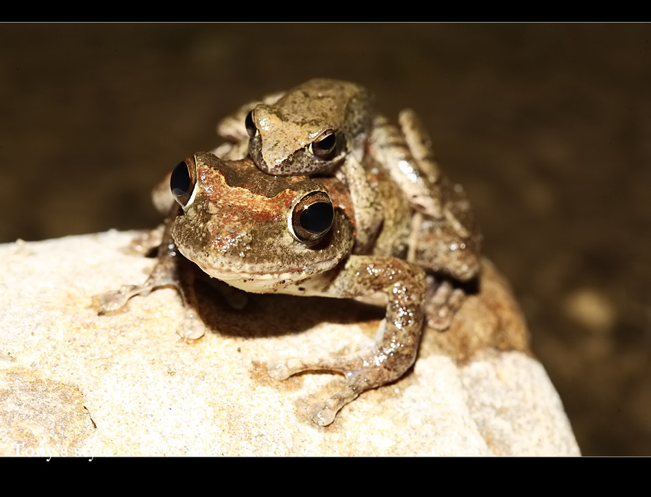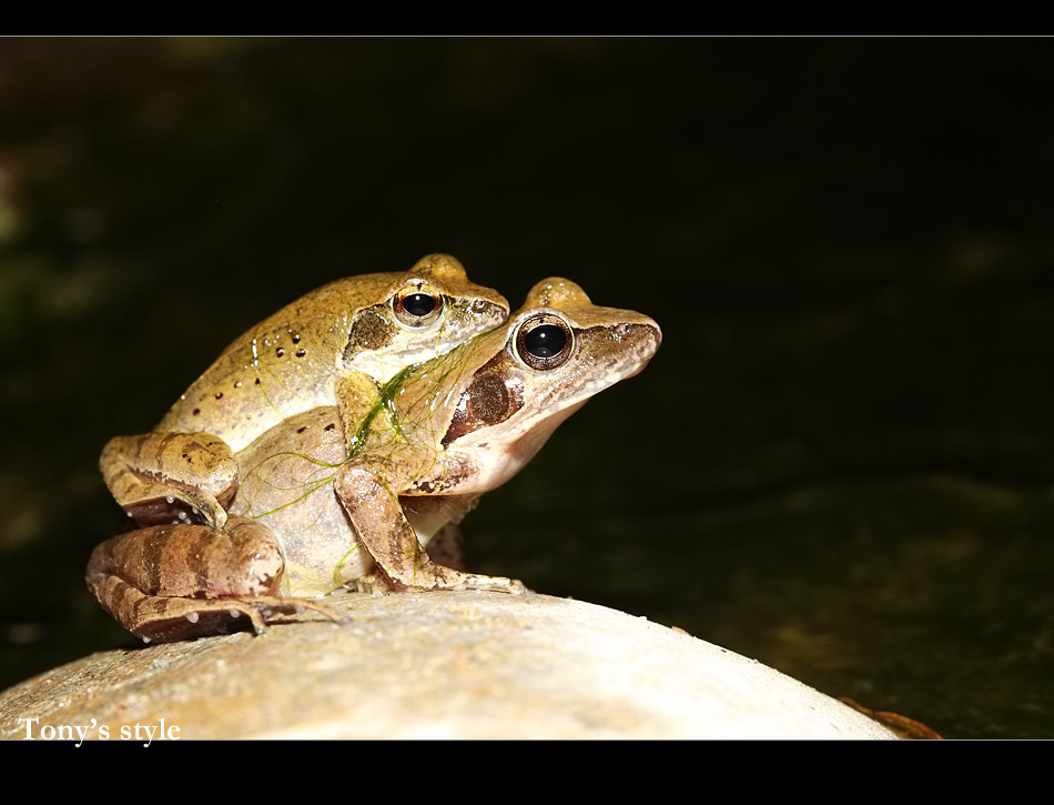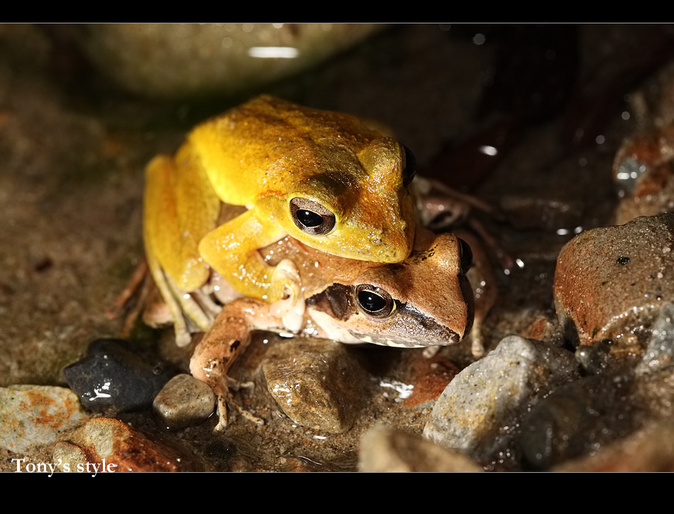 梭德氏赤蛙算是溪流型蛙種,但我之前在溪邊幾乎都是看到褐樹蛙,原因應該是時間不對(經過winsun大師解惑,他說褐樹蛙春天到秋初都有,梭德...只1-2個月... 宜蘭只1個月)小勛帶我到北坑溪旁,但寬近70-80公尺的溪床幾乎都乾了,穿過溪床來到橋下附近終於有涓涓細流出現,小勛很快的就在橋下發現一對正在抱接的梭德,然後第二對第三對陸續的發現...,沿著溪流巡了約200公尺,大約發現十多對抱接,但等到凌晨一點都沒不見下蛋>"<,小勛說他之前為了等下蛋和他們耗到早上五點,這精神真是太令人佩服了>"<