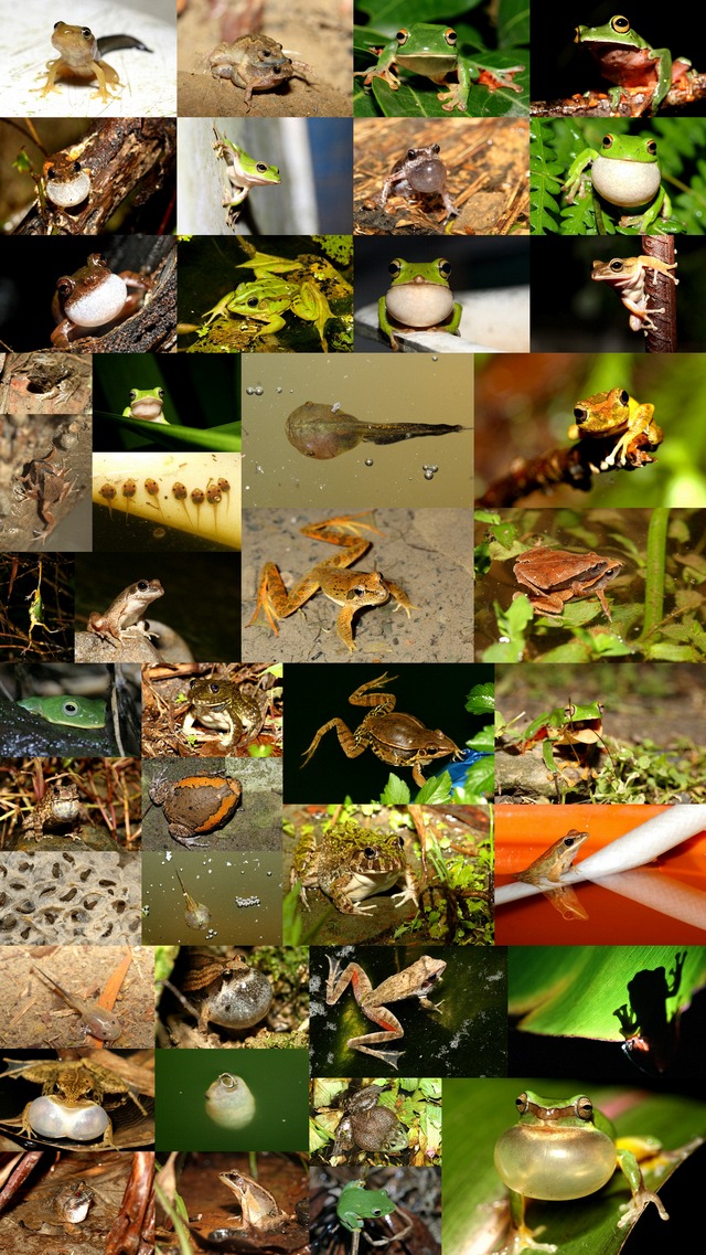 赤蛙科的和 蟾蜍科是最常見的蛙種,大安森林公園內可以聽到像狗叫聲的是貢德赤蛙,去年新聞報導林家花園的青蛙半夜吵死人也是貢德,另外池溏邊很容易看見的還有腹斑蛙,到了鄉下水田邊最常聽見的是澤蛙,他們外觀有些類以,多半擁有平滑的表皮、修長的身體和善於跳躍的後肢,體色常呈咖啡色、黃褐色或夾雜著綠色,在台灣共有13種。