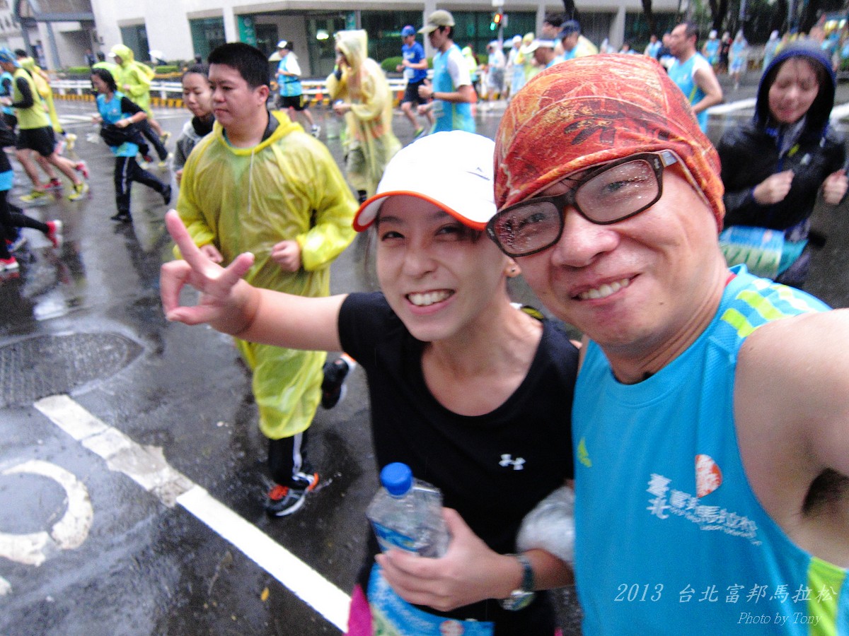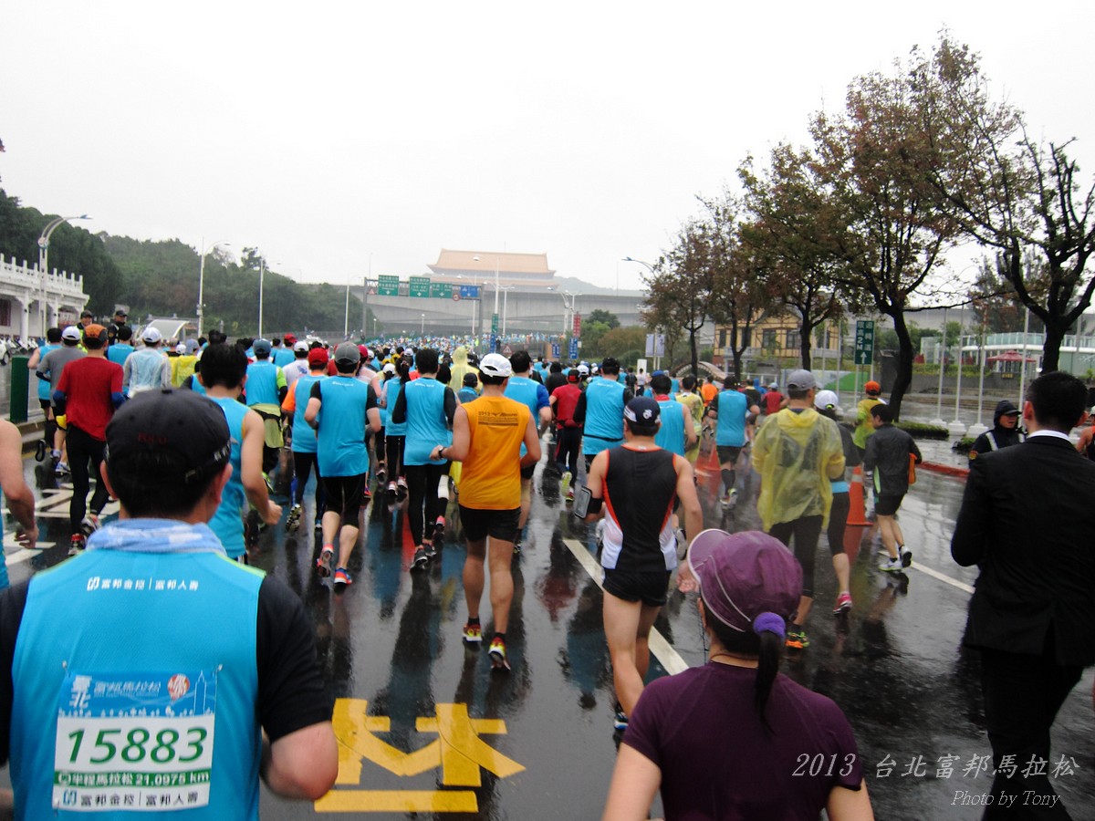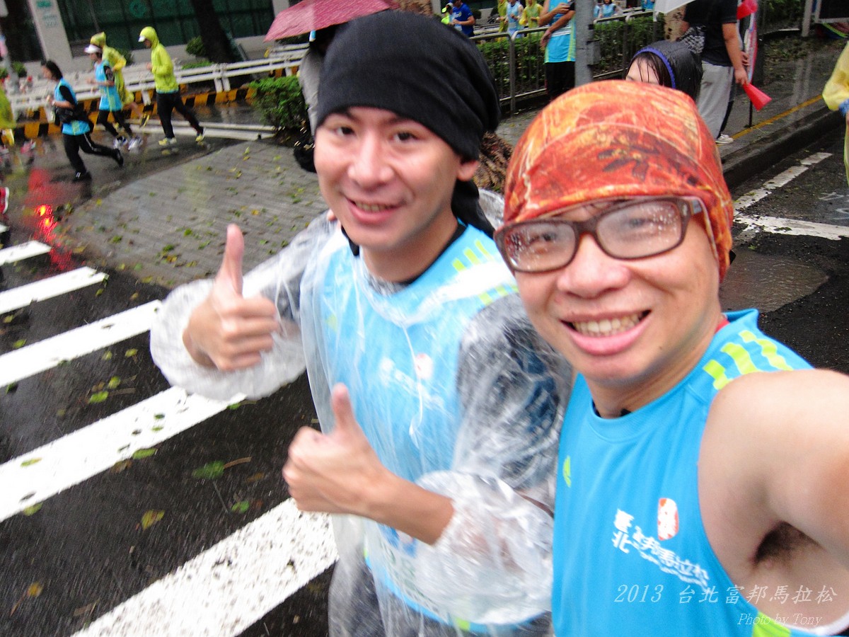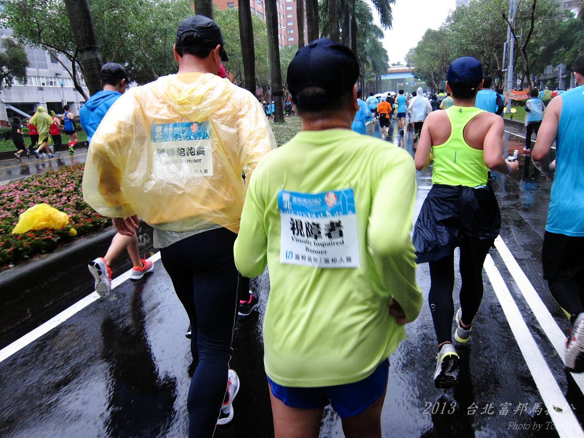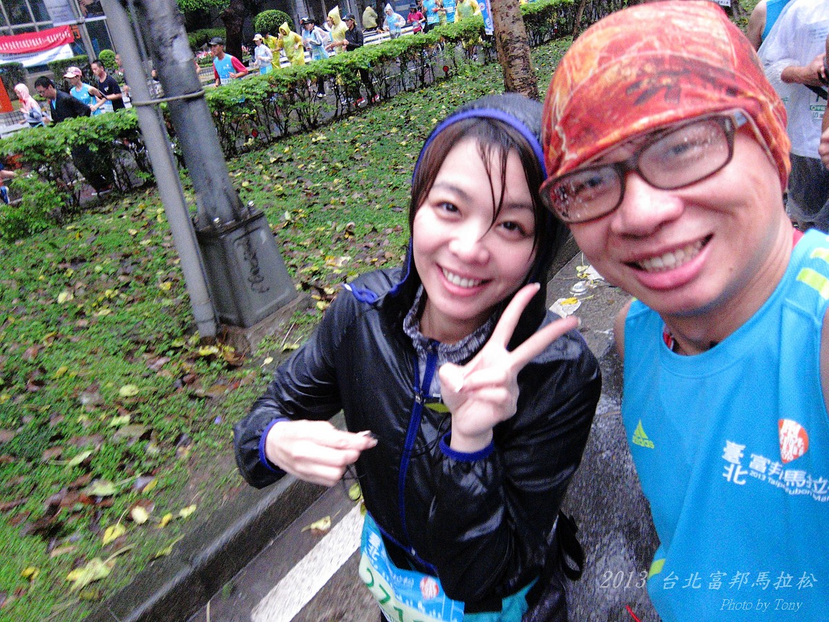 前一天看著天氣預報,心又涼了一截...降雨機率高達90%..Orz 上次太馬已淋了二個小時,我看這次又差不多了XDD 一早來到W和大家集合 因為起床太晚,只得匆匆吃了二個巧克力餅干就準備往市政府集合出發!! 又糊塗的忘了帶一包能量包,只好先和外星人小頡先借一包來放!! 雖然天空下著毛毛雨,但心情卻是熱的... 人也多到爆,擠了13分鐘才出計時拱門,一開始出發的選手都已跑到圓環去了~~XDD 且~~才出發就和大家擠散... 好吧~就慢慢跑吧~ 出發時二旁不乏加油的民眾,先來拍幾張~ 跑個1K~右邊出現了熟悉的聲音~(NATSUMI的笑聲~~) YA~~居然遇上NATSUMI了~ 趕緊過去和大家集合拍個照!! 然後路邊再拍個二張之後...大家又不見了XDD 好吧~遲早是要分開的,就按自己的節奏跑吧~ 不過要按自己的節奏也很難啦,路雖然大條,但人太多,尤其我幾乎又是最後出發的,6分速就得一路超車了XDD 且加油的民眾有時在左邊,有時在右邊,要切來切去有時還有點辛苦啊!! 像是中山北路幾位辣妹,我就是來不及切..跑過頭再繞回去拍的XD 反正....專心跑,和拍照跑,頂多也差個10分鐘而已,快個10分鐘,排名一樣很後面,慢個10分鐘卻多了這麼多可以回憶的照片,我想...這是值得的吧:P 就這樣...一邊跑一邊拍,在下新生高架橋時,居然也被國棟給追上了,看來最近二次每次二小時的LSD特訓真的有用,抽筋棟終於要一雪前恥了~ 跑到忠烈祠前大約11公里,在這的補給站把能量包給吃掉,再喝個半杯舒跑後,繼續向前挺進!! 不過~~就在自己身體覺得愈跑愈順時..,左小腿突然傳來一點點刺痛...Orz 按之前的經驗,我知道我的腓腸肌又出問題了~~ 上週自己用5分半的速度練跑近15k都沒事,怎麼這次在13-14k就出現問題?? 我想..可能是上週的疲勞還沒結束,週三練跑時,好像又稍微有拉到~ 雖然經過三天的休息已沒什麼感覺了,但終究在13-14k後就顯現出來了!! 我看似粗壯的蘿蔔怎麼會這麼弱啊XDDD 路程都已跑一半了,就繼續跑吧~ 降點速讓爆掉的時間延緩大爆發發作!! 就這樣撐到環快上面,雖然只剩2-3KM,但看見補給站還是去喝個水,喝個餅干和香蕉 再到護理站去噴個肌樂!! 沒多久就看到全馬的前導車從後方開過來了 哇塞,第一名回來了,肯亞的喬瑟法·傑可波(Josphat Kamzee Jepkopol)從我身邊飛快的跑過,超強的啦~~ 最後出了基隆路的地下道,只剩最後1KM,大家也都加速了起來,突然被一個小個頭女生刷卡而過,又激起我的鬥志,雖然蘿蔔痛,但還是要看一下刷我卡的是那位女生,努力的用5分速跟上去,只敢拍個背影,不好意思拍正面...XDD,最後200公尺,她再度加速...,我為了要拍照,只好目送她遠離XDD!! 這次成續2:09"15,比太馬退步了一點點~ 我想..照片拍的比較多一些,再加上蘿蔔痛是最大的主因~ 不過這成績我是覺得還可以了啦,蘿蔔痛才是我在意的~(經過一天的休息、冰敷、上小腿套再貼上撒隆適布後,情況已好轉很多~) 未來~我看~得多加強我的蘿蔔訓練才行!! 這次台北富邦,本想希望看能不能請老婆帶著兩隻小鬼來終點幫我加油~ 但這雨實在太大~~ 只好看看下次有沒有機會了!! ^__^ 距離: 22.22 公里 時間: 2:09:15 平均步速: 5:49 分鐘/公里 平均心率: 162 bpm Avg Run Cadence: 180 spm Avg Vertical Oscillation: 7.3 公分 Avg Ground Contact Time: 245 毫秒 Avg Stride Length: 0.95 公尺 衣保袋一個100元,很大,可以裝很多東西,不過不防水,這種天氣自己的乾衣服要用塑膠袋再包起來!! 為了富邦馬,第一次搭信義線捷運!! 捷運提早發車,許多人都搭捷運來市政府前集合!! Go Fun 準備集合出發了!! 原諒我的小相機在燈光不足下的效果實在....Orz GOGOGO~~(KT你終於出現在我的相機裡了!!) 我們還沒出發,前面的己經跑到仁愛路圓環了!! GO~出發!!(大家都不見了XD) 後面的無臉人是怎麼回事XDD YA~~撿回Go Fun隊員--林庭瑄 這次進步超多的果凍~ 撐到9K還是ITB的WES~XDD 賽完以為自己破PB的NATSUMI~:P 看到相機就瘋了的大家XDD 讚讚讚~~有觀眾加油真的跑起來比較有力!! (這裡才不到3K~當然很有力~:P) 也有視障者加入,毅力讓人佩服!! 加油~加油~ 加油~加油~ 斯巴達出現了~ 空姐出現了~~ 熱情的民眾~ 格格也在總統府圓環出現了~~:P 就是這幾位辣妹~讓我沒破PB的~ 阿姨加油~辛苦了!! (晴天的話很想多拍台北市風景,但下雨一片霧茫茫..只好多拍加油的民眾!!) 全馬半馬在這裡要分開了(分開後..人還是一樣多XDD) 雖然下雨,但還是滿滿的人潮!! 經過忠烈祠了!! 白蘭氏這幾位加油的美眉真可愛^O^ 這二位穿著白西裝和小禮服來跑步,好猛啊!! 要上快速道路了!! 折返點到了!!終點不遠了! 半馬靠內跑,因為...第一名要來了!! 第一名回來了,肯亞的喬瑟法·傑可波(Josphat Kamzee Jepkopol)從我身邊飛快跑過,超猛!!一下子就不見了~~ 大家幹嘛這麼HIGH~ 因為地下道上頭有攝影師啦!! 就是這位妹妹,最後1K把我刷卡了XDD 終點到了!!終點到了!! 2小時23分抵達!! 我的眼鏡起霧了!! (難怪一片霧茫茫 XDD) 排隊領毛巾和獎牌!! 跑的時侯不會冷,一停下來就覺得冷了! 大家紛紛把大毛巾給披上!! 我的晶片沒有去退還,就捐給罕見疾病基金會了!! 獎牌的質感還不錯~(但我拍的背面去了XD) 坐在角落竊笑的小花 恭喜林庭瑄完賽 Go Fun大集合~ 回家前撿到外星人小頡,以3:39完賽,真是太強大了!! -------------------------------------------