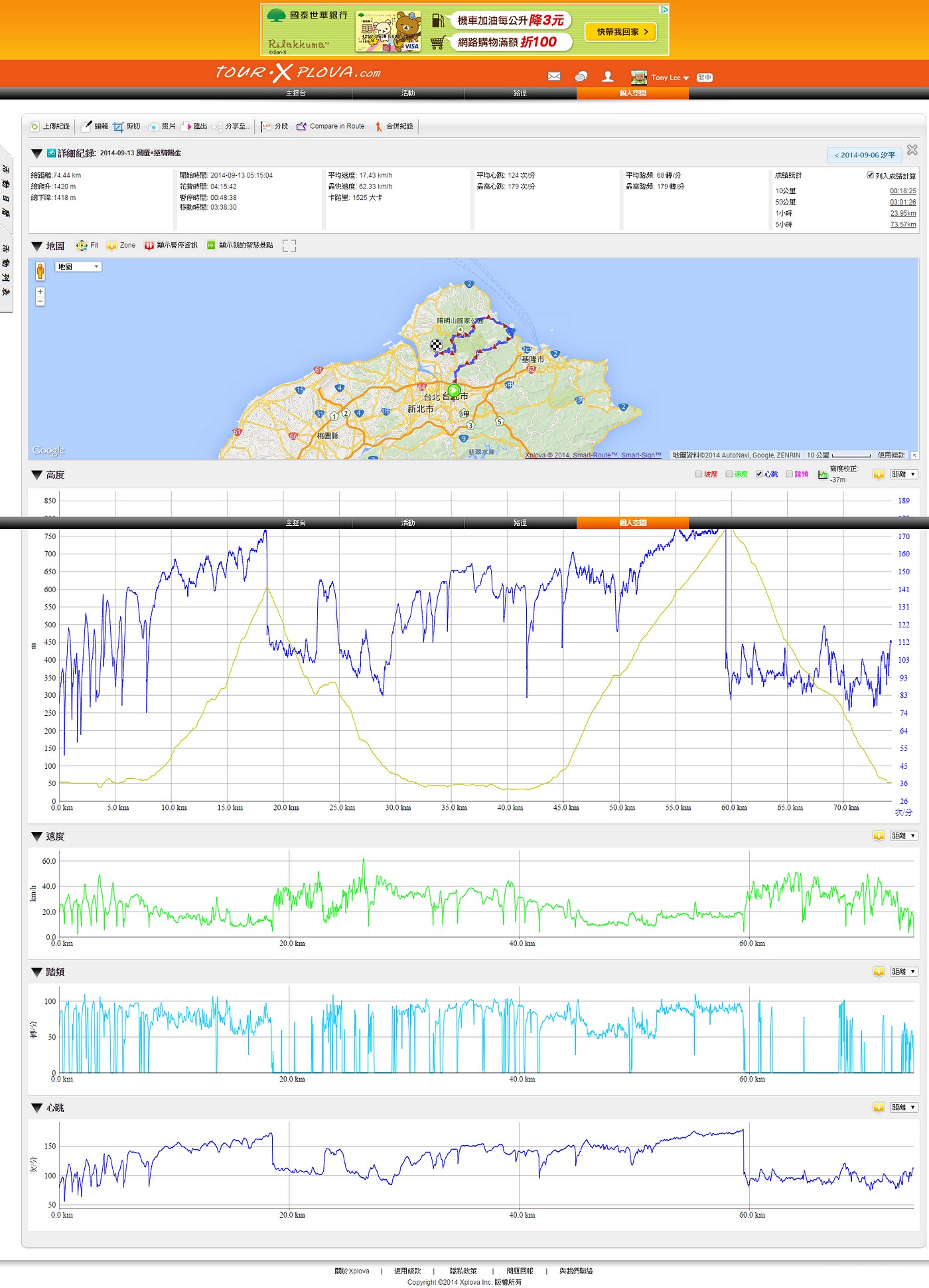 這次natsumi約騎上次小油坑騎車路線 不愛短時間內騎相同路線的我,糾了年輕爸--陳大鼓一起來去騎2P 並預訂9:00和NATSUMI在小油坑會合(其實依NATSUMI的實力,從新北投捷運站到小油是不用2小時的,不過大家若多在前山公園多喇賽一下就差不多啦!!) 計算一下2P所需時間.. 故宮到風櫃嘴估一小時 風櫃嘴到金山再估一小時 金山上到陽明山頂..因看錯資訊,只估70分鐘XDD 想想5:30集合上山就可以騎的很愜意了!! 沒想到..一開始我就東摸西摸..遲到快10分鐘 要出發時已經5:4X了.. 趕緊上路...直上風櫃,楓林橋也不停.. 反正順順騎,不拉強度,一方面也要訓練肌耐力 不然老是騎個20-30分鐘就休息 這樣很難培養長程的肌耐力來! 不過我的有氧騎對陳大鼓來說似乎辛苦了點 他的車飛輪又只有25,所以風櫃中段10%的坡對他來說實在有點折磨.. 所以最後2k我就先棄他而去,故宮-風櫃以約47分完成 不過他也騎的太用力了,到了風櫃後居然說有點想吐的感覺XDD 小休一下就往金山出發,這段只有一小段上坡,其餘不是下坡就是平路,算是輕鬆好騎..不過也騎了47分鐘才到金山.. 小休一下,7:40出發逆騎陽金往小油坑.. 沒好好做功課..以為只有約15KM左右~ 沒想到最後騎了18KM~~XDDD 前半段配合著掛掉一半的陳大鼓慢慢騎,一半之後看看依那時的速度可能9點前無法抵達小油坑 只好忍痛先海放陳大鼓..XDD 這一段一共騎了73分鐘.. 若真的要一路慢慢騎..大概得估80分吧:P 只是沒想到隊長和NATSUMI早就到了,在那納涼等我.. 哈哈~~聽說為了不要讓我先到,這次騎的很認真^^ 下山來去NATSUMI推薦的豆花店吃豆花 豆花不錯吃,但老板態度真是不怎樣..,紙碗,十碗..傻傻分不清!!XDDD 下次...換一家吃吧:P 2014-09-13 風櫃嘴+逆騎陽金公路軌跡