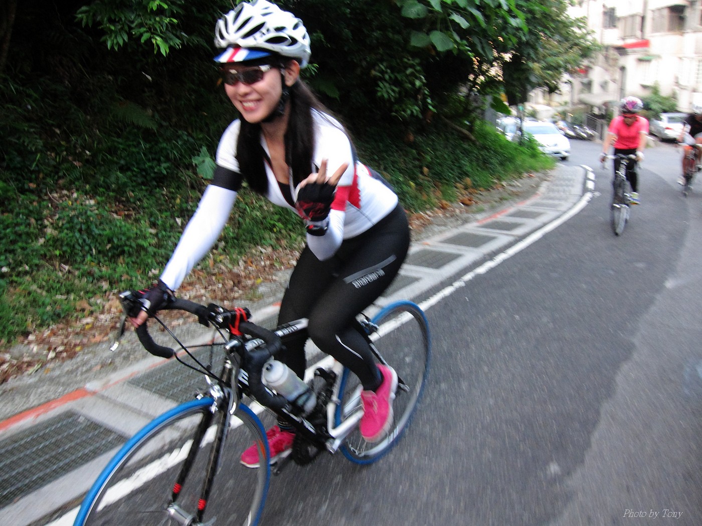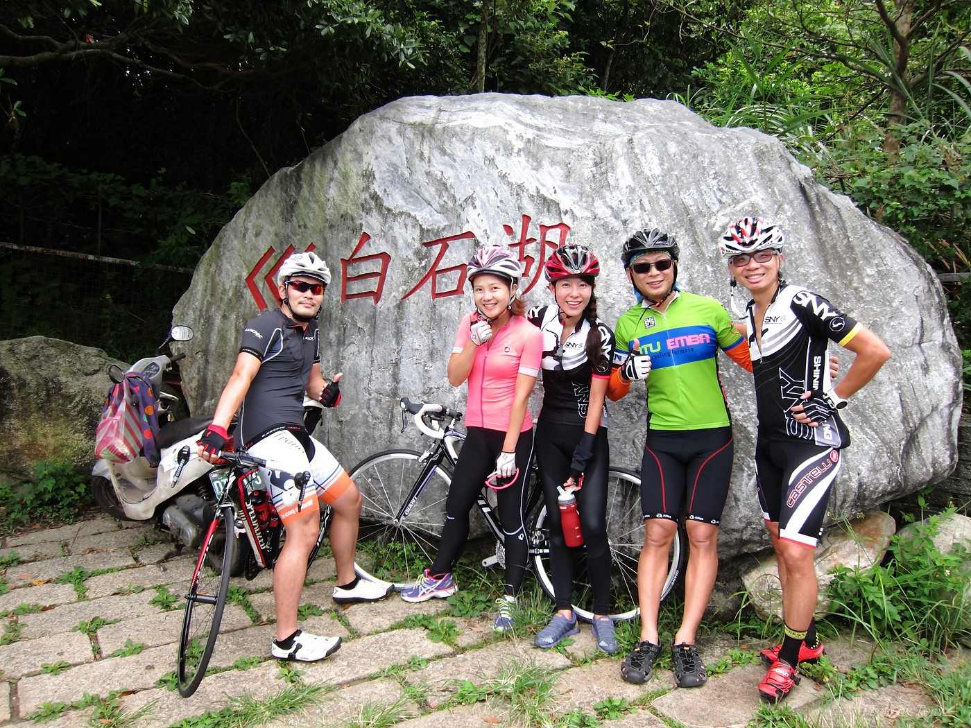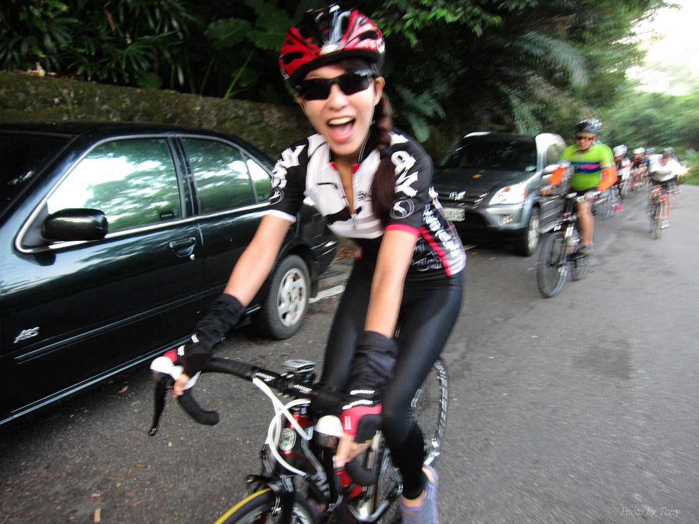 以前石頭車隊約騎,大概都會拖到星期四,甚至星期五晚上才決定 有了新進認真隊員 -- 林庭瑄加入後 現在隊長大概週一週二就會公佈約騎地點和時間 真是不能小看林庭瑄的影響力啊!! 這次行程一出來,真是差點跌破我眼鏡.. 6:00 大湖捷運站集合,預計騎內湖五指山和冷水坑這兩P~ 隊長家離內湖很遠..所以從內湖上五指山這路線,他從來沒騎過!! 居然還約個6點,我想他應該5點就要出門了!! 再來五指山和冷水坑這2p都不算輕鬆,林庭瑄想一次ko~真的是不容易!! 只能覺得..以前的我們怎麼那麼沒勇氣一次挑戰2P的路線..唉!!XDD 聊著聊著也就把SNY的安妮媽一起找來 在謝大哥和昌總的鞭策下,安妮媽目前從山底小七騎到山頂約45分左右!! 45分快不快?? 嗯~~N年前和山豬第一次騎...騎到臉色發白,最後是一小時出頭才抵達!!XDD 2年前在換SCOTT之前,和PETER順順騎了一次..51分登頂 今年7月,小猴約騎風櫃嘴,和LEO二人以心跳不超過170來騎一趟,43分多完成!! 所以面對安妮媽來襲,我心裡算是有底的!!不過..可惡的阿帆,居然在前一天幫安妮換上跑零!!! 這天一開始先由MARCO開始領騎 石頭車隊中蛋蛋有PETER看著,ARIEL有叫念保護 所以我和STONE也都跟著上去.. 前半段我心跳大概都落在160-170間 有一段,STONE轉頭問安妮說:「這是你平常練習的速度嗎??」 安妮媽回說:「是啊~~」 換我和安妮媽說:「你最快騎45分耶~~」 安妮媽回說:「那是被謝大哥逼的~~,沒有每次都那種速度啦!!」 可是..我發現雖然一用力可以小拉開安妮媽,但只要緩和一點,馬上就有魔音穿腦.. 什麼魔音??安妮媽車上還裝一個大喇叭啦,人沒到聲先到,好恐怖XDD 就這麼和安妮媽糾缠了6公里多~ 最後2公里多,看看好像有機會破一下上次的記錄,就用力騎騎看,心跳最高拉到181.. 最後以42分多達陣..小小進步40秒XDD 而安妮媽和STONE也在1分鐘後抵達!! 以43分多的成績完成!! 還好這一年有持續練習,不然就要被安妮媽這個新手給KO了XDD (安妮媽買公路車大概不到1年的時間~~) 在山頂上繞了幾圈後再下山去撿人... 下滑了2k撿到peter和蛋蛋~~ 再和他們一起慢慢騎上去 沒想到林庭瑄沒來,大家就想就地解散,真是太惰落了~XDD 不過~~騎上五指山也運動到了,大家開心就好!!:P 期待下次繼續LDS團騎~~^^
