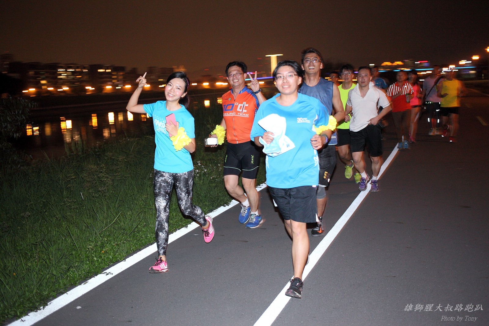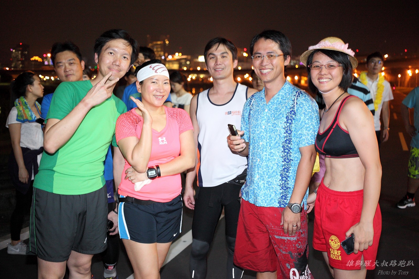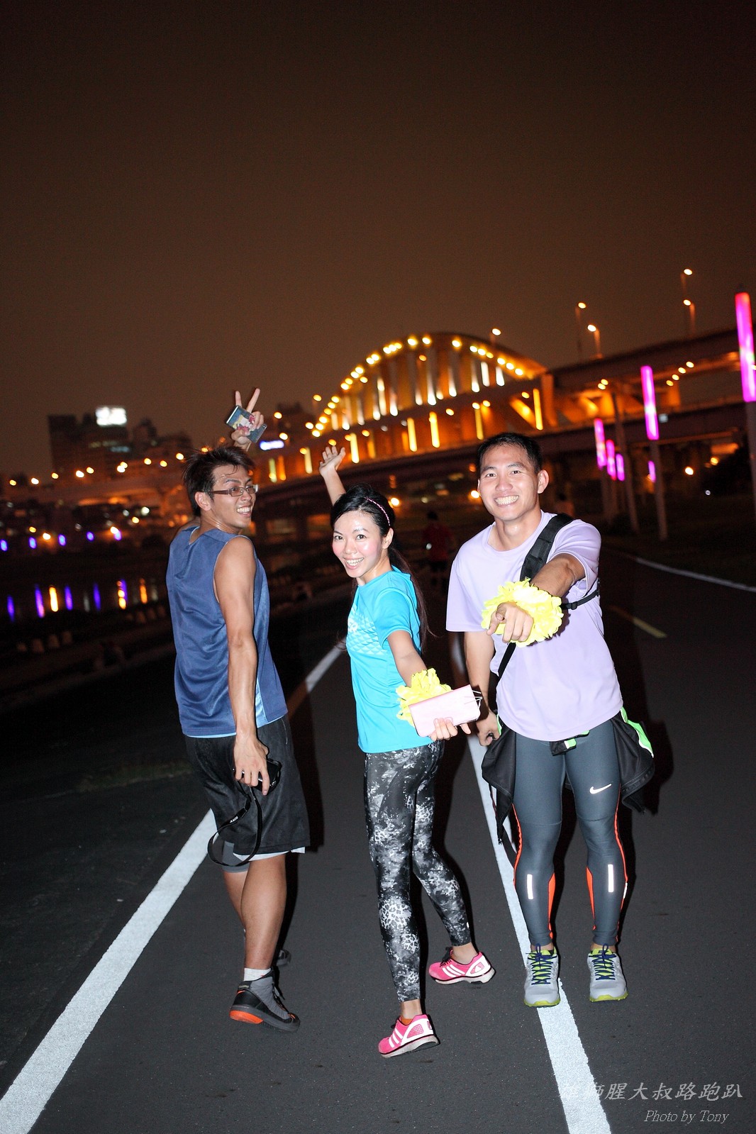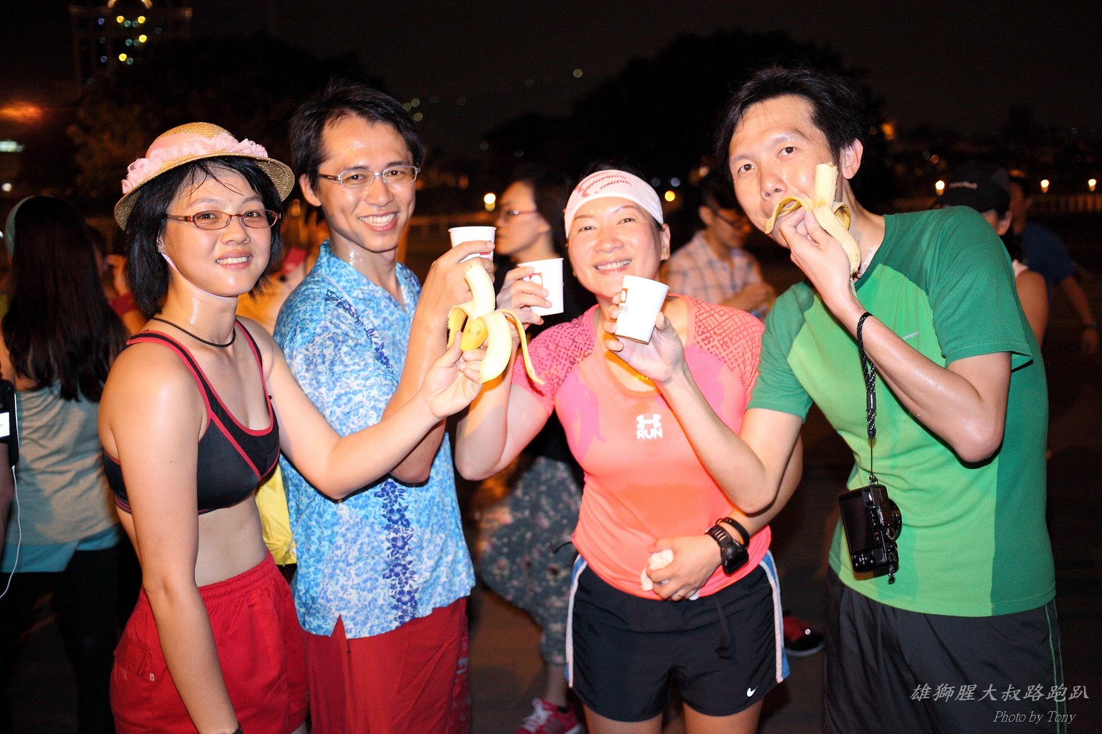 碰村長近來接管欣女孩而晉升為腥大叔(因為一直在欣女孩更衣室出沒~~) 最近分享一個好康的路跑趴活動...(其實是希望糾到300人來參加活動!!) 身為腥大叔的好朋友,一定要來贊助一下的!! 後來沒想到松哥和小猴也都要來參加!! 這活動只跑8k~應該會7-8分速慢慢跑吧~(我天真的這麼想~) 所以就帶著單眼出門 順便也體驗一下若明年抽到東京馬,要不要帶單眼跑全馬... 沒想到領跑的夏美前3.5k都可以跑在6分速內... 還好叔叔有練過,還可以跟的上.. 只是帶著跑3.5k,手就痠了,若要跑全馬,手應該會斷掉吧XDD (中間欣男孩屏哥還從後方殺出來,我卯起來用5分整的速度才追上...Orz) 中間休息點備有香蕉、紅茶和開水.. 沒有吃晚餐就來跑有點肚子餓,加上大會說沒有吃完不要跑回去...就一直吃一直吃,吃了2-3根吧!!哈哈哈~ 感謝腥大叔介紹這個有吃有的玩的活動!! 下次期待你再辦ponki盃喔!!^+++++++^ PS:本次照片用Canon 5D2+ 40MM F2.8 餅干鏡 + 270EX2小閃燈拍攝,270EX小閃燈的效果,比想像中好耶..(照片都是閃燈直打) 艾雪說...她要一張和natsumi一樣假掰的照片.. 恭喜你..今天你假掰第一名:D 這是一個膝蓋痛的概念?? 人太多...鏡頭不夠廣,塞不下XDD 邊跑邊拍的失敗率真的很高,因為常常對不到焦,快門根本按不下去..XD 屏哥的殺氣好重~ STONE看到小猴要來也就馬上手痛不打羽球改跑步了~~(指) 二位真的好恩愛啊!!! 可愛又有活力的小猴!! 黃艾雪一直被這位攝影師要求拍照啊啊啊啊啊~~~ YA~~和美灑的松哥合照了:D