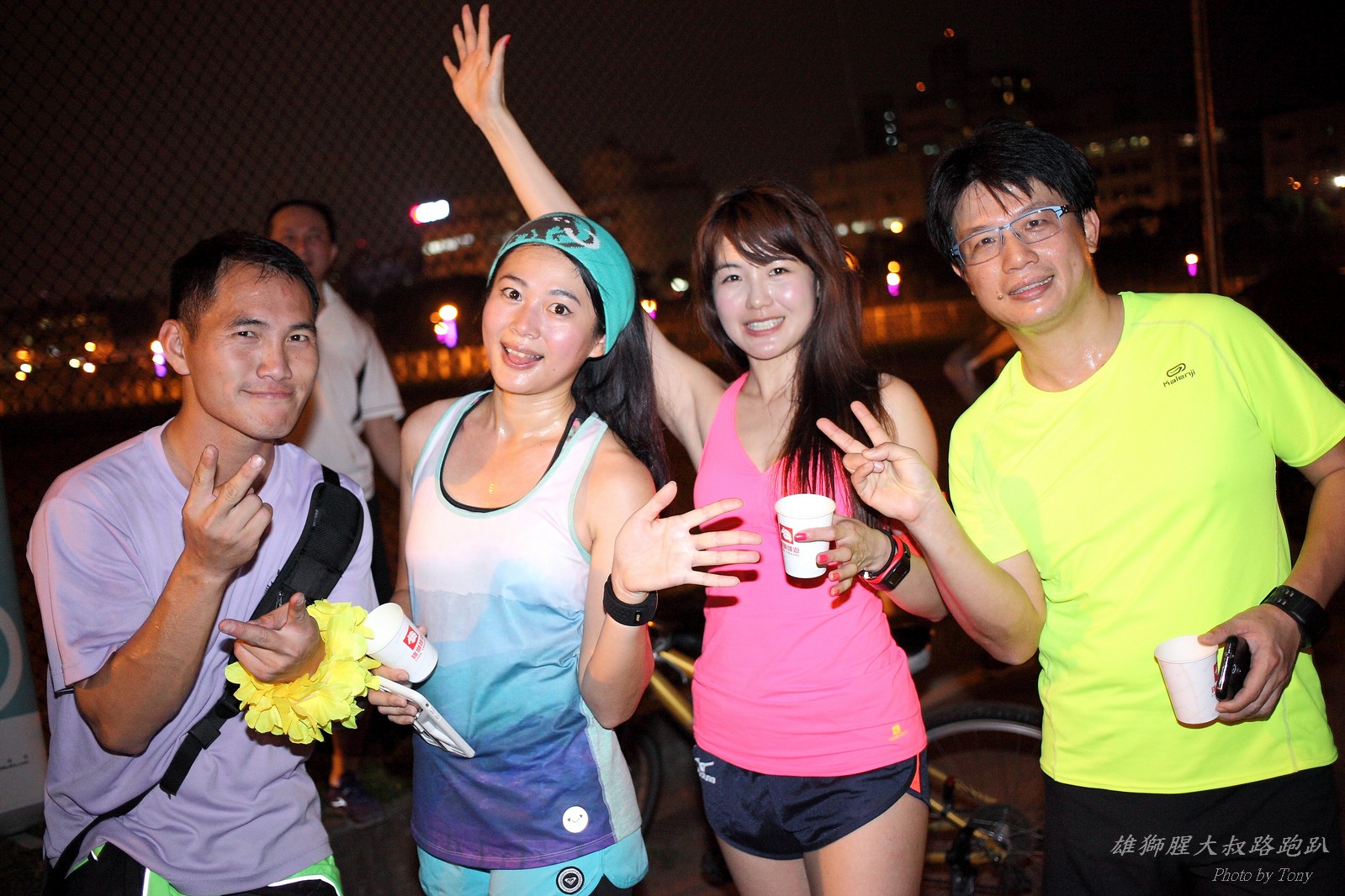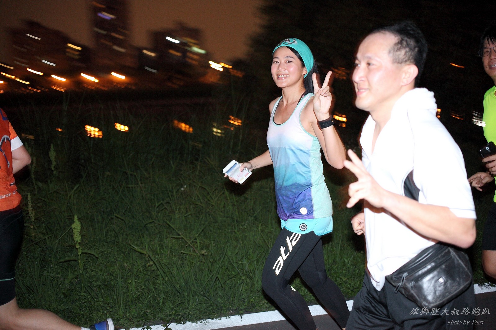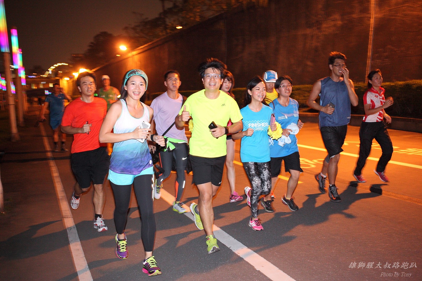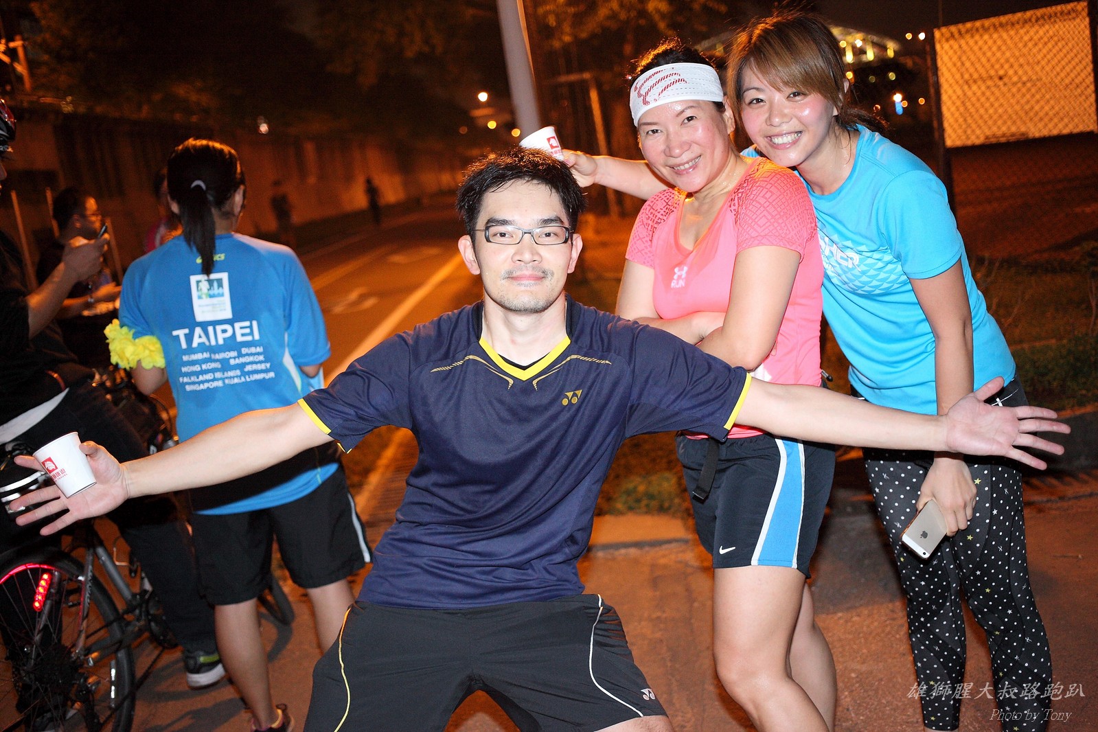 碰村長近來接管欣女孩而晉升為腥大叔(因為一直在欣女孩更衣室出沒~~) 最近分享一個好康的路跑趴活動...(其實是希望糾到300人來參加活動!!) 身為腥大叔的好朋友,一定要來贊助一下的!! 後來沒想到松哥和小猴也都要來參加!! 這活動只跑8k~應該會7-8分速慢慢跑吧~(我天真的這麼想~) 所以就帶著單眼出門 順便也體驗一下若明年抽到東京馬,要不要帶單眼跑全馬... 沒想到領跑的夏美前3.5k都可以跑在6分速內... 還好叔叔有練過,還可以跟的上.. 只是帶著跑3.5k,手就痠了,若要跑全馬,手應該會斷掉吧XDD (中間欣男孩屏哥還從後方殺出來,我卯起來用5分整的速度才追上...Orz) 中間休息點備有香蕉、紅茶和開水.. 沒有吃晚餐就來跑有點肚子餓,加上大會說沒有吃完不要跑回去...就一直吃一直吃,吃了2-3根吧!!哈哈哈~ 感謝腥大叔介紹這個有吃有的玩的活動!! 下次期待你再辦ponki盃喔!!^+++++++^ PS:本次照片用Canon 5D2+ 40MM F2.8 餅干鏡 + 270EX2小閃燈拍攝,270EX小閃燈的效果,比想像中好耶..(照片都是閃燈直打) 艾雪說...她要一張和natsumi一樣假掰的照片.. 恭喜你..今天你假掰第一名:D 這是一個膝蓋痛的概念?? 人太多...鏡頭不夠廣,塞不下XDD 邊跑邊拍的失敗率真的很高,因為常常對不到焦,快門根本按不下去..XD 屏哥的殺氣好重~ STONE看到小猴要來也就馬上手痛不打羽球改跑步了~~(指) 二位真的好恩愛啊!!! 可愛又有活力的小猴!! 黃艾雪一直被這位攝影師要求拍照啊啊啊啊啊~~~ YA~~和美灑的松哥合照了:D