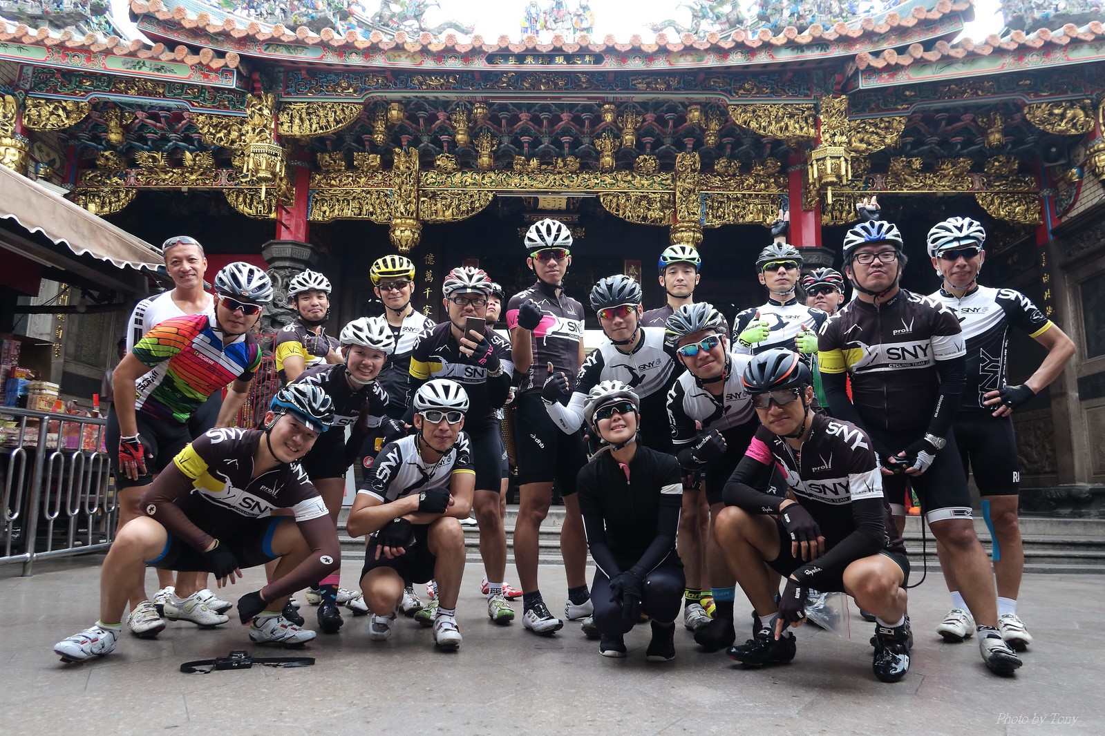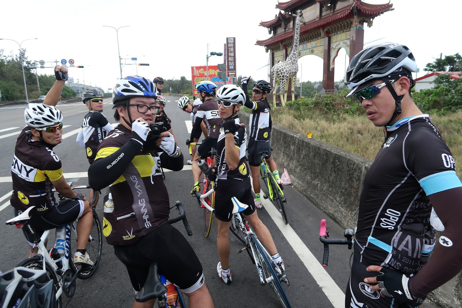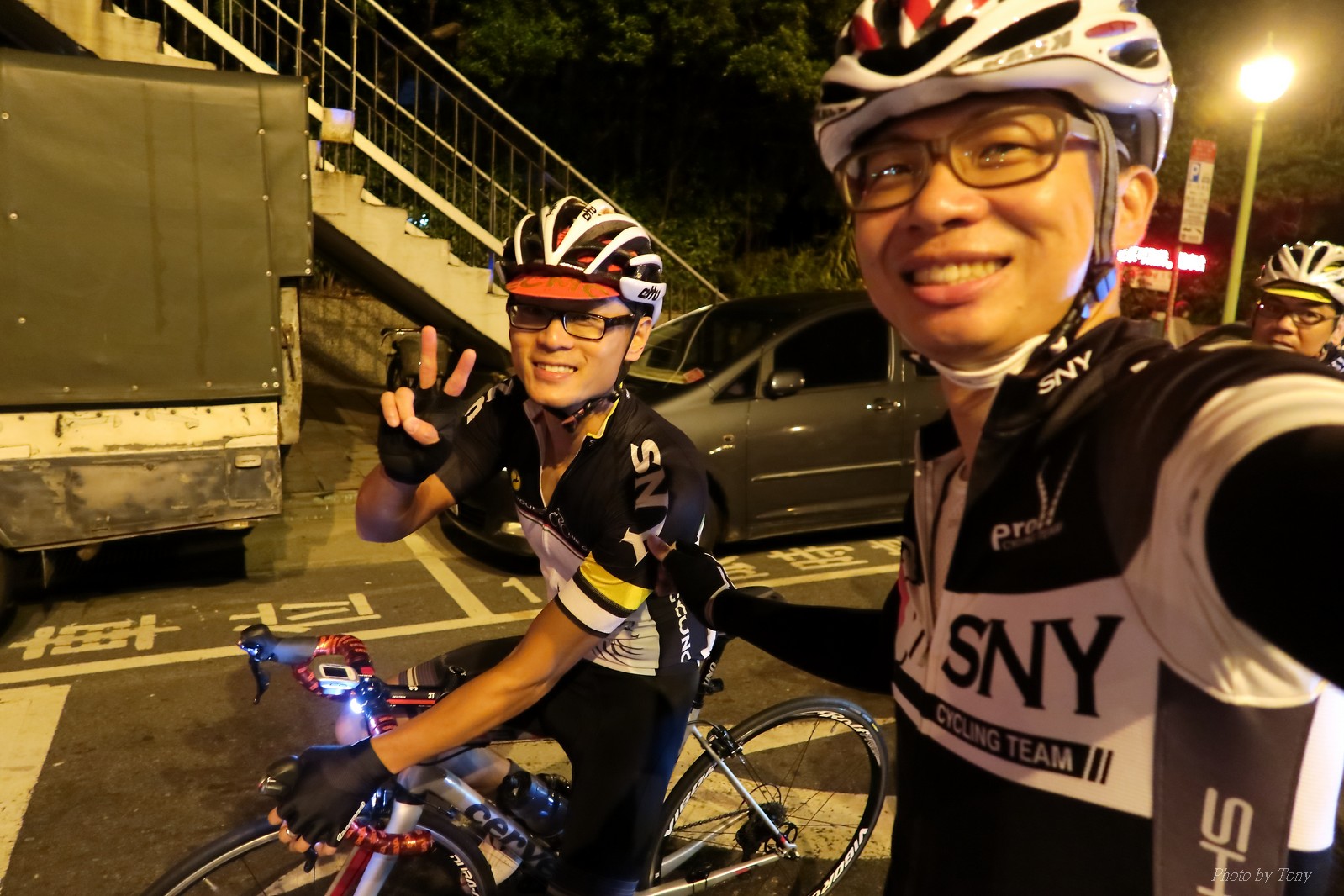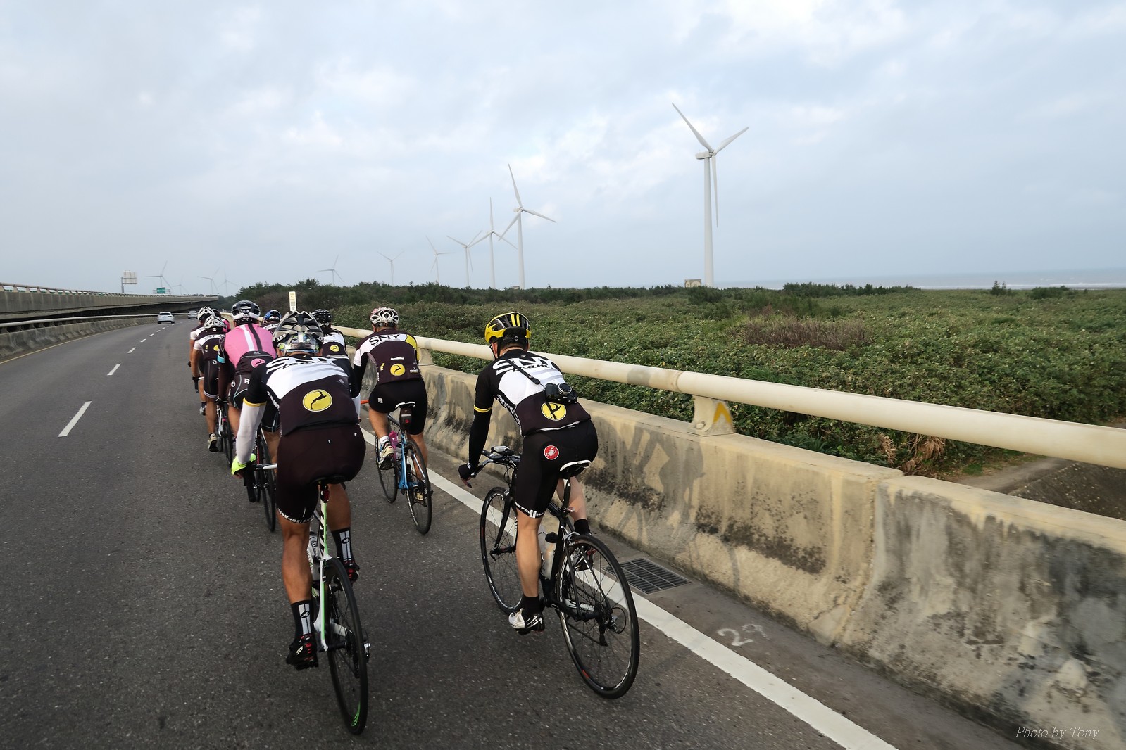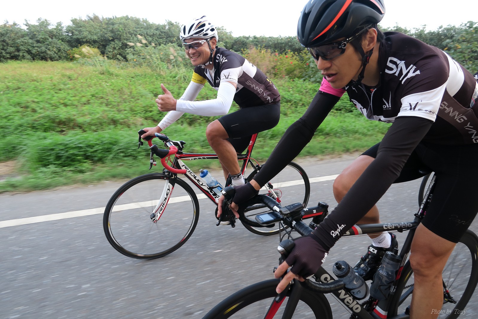 SNY 騎福之旅列車在11/19啟動 一連四天要誠心拜訪台灣9間廟宇 帶著大家的祝福紙條,誠心祈求上天保佑這群熱血的車友 因為體力弱加上上星期也已請過假,這次就報名參加第一天台北到台南的旅程就好 雖然第一天騎西濱再接省道,但人氣也最旺,應該很好玩吧!! 星期四一早不到4點就起床..整裝好出門買個飯糰後趕緊往行天宮集合 好幾位今天沒能一起騎到台南的車友也一起來集合,感覺好溫暖!! 今天的目的地是到台南南鯤鯓,總共300多公里,所以要早早出發(所以我沒和爸媽說要去那騎車,說要去騎去台南,應該會被唸到翻吧XDD) 大夥在黎明天亮前出發... 慢慢騎到八里和另外一團集合 若說去年的北高SNY團是一群精力充沛的高中生,那這次的騎福團真的像是小學生一樣 一進入西濱,二路縱隊馬上乖乖排好..(只有獅王偶有耐不住性子出去奔跑一下:P) 也可能因為是E神和500光在前頭領騎,大家都很乖吧~哈哈!! 今天的風沒有很大..但領頭羊輕輕踩,時速也就30多了 有別於去年sny北高團 今年EASON、光叔、雷射槍清志哥還有麻美都有安裝功率計.. 不用體感,不用心跳也不用時速來控速..,這次都用瓦數來控制強度(用體感,心跳和實際瓦數真的有一段落差!!) 大概就是180-200W來破風領騎 後面只要躲的好,大概只需150W就可以穩穩跟上.. 所以一路跟到新竹算是輕鬆愉快啊~(但是半路到永安就肚子餓了XDD,我明明吃了一個大飯糰啊,趕緊在進新竹前又吃了一大個飯糰!!) 從西濱轉進新竹市,雖路程不遠,但紅綠燈擋個幾次就耗上不少時間 大家在城隍廟拜拜之後,就趕緊上車趕路 所以出了新竹之後,領頭羊將瓦數提高了一些..(雖然我只有騎一天,但實力太弱,只能躲好再躲好XDD) 在進入苗栗好望角前,EASON頻頻回頭問有沒有人知道如何切西瓜避開好望角的上坡,不過沒人回應...知道路的好像都已被放生了XDDD 主團就由500光領軍一路上攻好望角,看著功率計的數值一路往300W衝上去..,媽呀,要這麼殺嗎?? 降降降,降到250W就好,還是逐漸被麻美拉開..,後來看到EASON慢慢退下來,叫大家慢慢騎就好,路還很長,不要在這太衝動..,我再將瓦數降到230W左右.. 一回頭,一群人全擠在我後方..,呃...壓力有點大!! 離頂點最後300公尺,大家按奈不住,紛紛從我身旁噴出去.. 嗯..我要繼續忍住,不差這一點點距離... 待上到頂點再抽車加速衝下坡來追... 這次騎福之旅沒有安排白沙屯媽祖廟,所以整團就直接沒休息繼續往前行 不過後來發現後方幾位車友被放生的有點遠,大家還是決定先暫停休息 等到全員到齊再出發,我叫寶寶趕快往前擠,不然領頭羊紅燈一起步加速,愈後面離愈遠,都要抽車才能追上,會很累.. 不過她說在前面壓力好大..且跟一跟就又慢慢掉隊了!! 老實說寶寶的實力耐力真的不錯,不過要在一群男生裡騎車,還真是辛苦了些!!(蛋蛋怎麼沒有來一起陪一下!!) 且這一段瓦數有時拉的比較高,所以這一段又有幾個人被放生..快到大甲鎮瀾宮前我也快撐不住了..>"<.. 還好就到叉路口了,呼,在崩潰前逃過掉隊的一刧!!(其實瓦數還是沒有拉很高,但就是跟的有點累,最近這一個月都沒有外騎長距離..耐力肌力明顯不足吧!!) 在大甲鎮瀾宮祈福加吃飽喝足後..不知不覺已經休息一個半小時.. 得要加緊趕路了.. 但台一省道上不斷的紅綠燈,騎到讓人快崩潰XDD(一公里可以停個2-3次紅綠燈~) 過了台中之後因為時間比預計慢了2小時,決定不要再騎台一線,要從台19切往西濱去,騎啊騎,不一心又錯過了日盛大哥要和我們會合的追分車站XDD) 後來愈往南部感覺愈來愈順,就決定一路騎台19就好 天色也在進入雲林之後明顯暗了下來.. 大家備好頭燈尾燈,繼續加班往嘉義挺進... 而為了安全起見,雖有體力,但跟不上主團的寶寶還有身體不適的狐狸都被勸上車 進入夜晚,騎起來是很涼很舒服,但因視線不佳的關係,讓我不得不全神貫注的跟車.. 騎起來有心驚驚的感覺XDD 不得不說麻美好有力,一路時速35上下,從彰化把大家帶領到北港,都不會累的,真的好勇猛!!在家插香練功有成!! 晚上7點多,終於抵達北港,離最後一站台南南鯤鯓代天府只剩30公里左右了 呼..快成功了!! 不過...聽說今天住的地方離南鯤鯓還有將近50公里...Orz 媽呀,算算時間,今天至少要加班到10點半以後>"< 再搭朱大哥的車回去..那不就半夜2點了.. 而本來要搭朱大哥回台北的車友有8位 2位沒來..,2位已先行搭高鐵回程!! 連我剩下四位..我提議我們四個先搭高鐵回去 感謝獅王、小游和發哥同意我的任性,都要一起陪我上高鐵..(這樣朱大哥的車也不用再來回跑!!) 離開北港前,自己還特地先繞到朝天宮天拜拜,祈求保佑家人朋友健康平安!! 再和主團說byebye~ 然後最後11km獅王就火力大開,整天下來心跳唯一突破170的就是這了 一整個回家前要把膏用完的概念XDDD 8:36上高鐵,10:00就到台北,一整個飛快!! 且前後輪用大垃圾袋包一包就上車,前後輪都不用拆,真是太方便了!!高鐵真是比台鐵友善太多了,是遠程單車族的好朋友!! 今天感謝SNY大家一路的照顧,雖不圓滿,但大夥平安成功!!:D