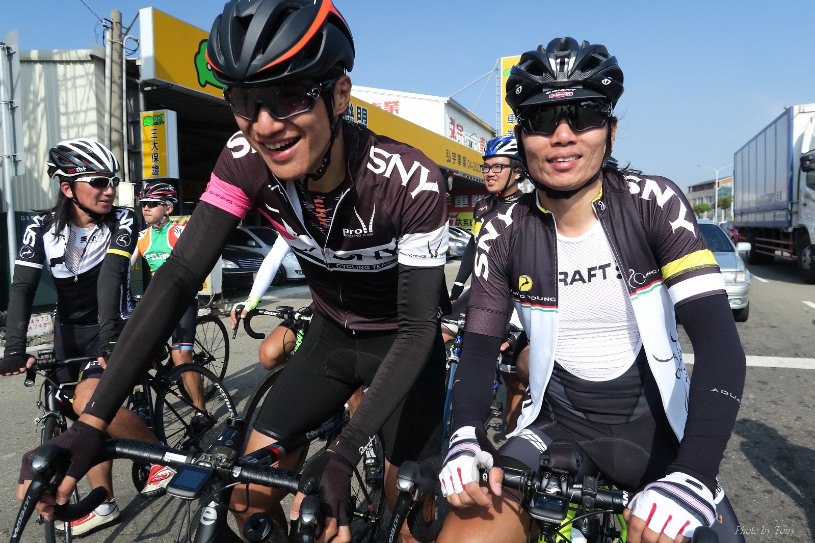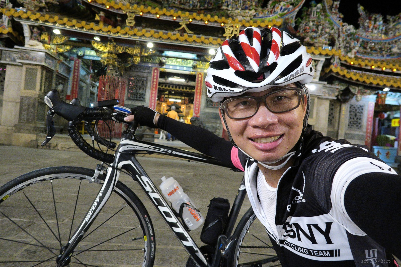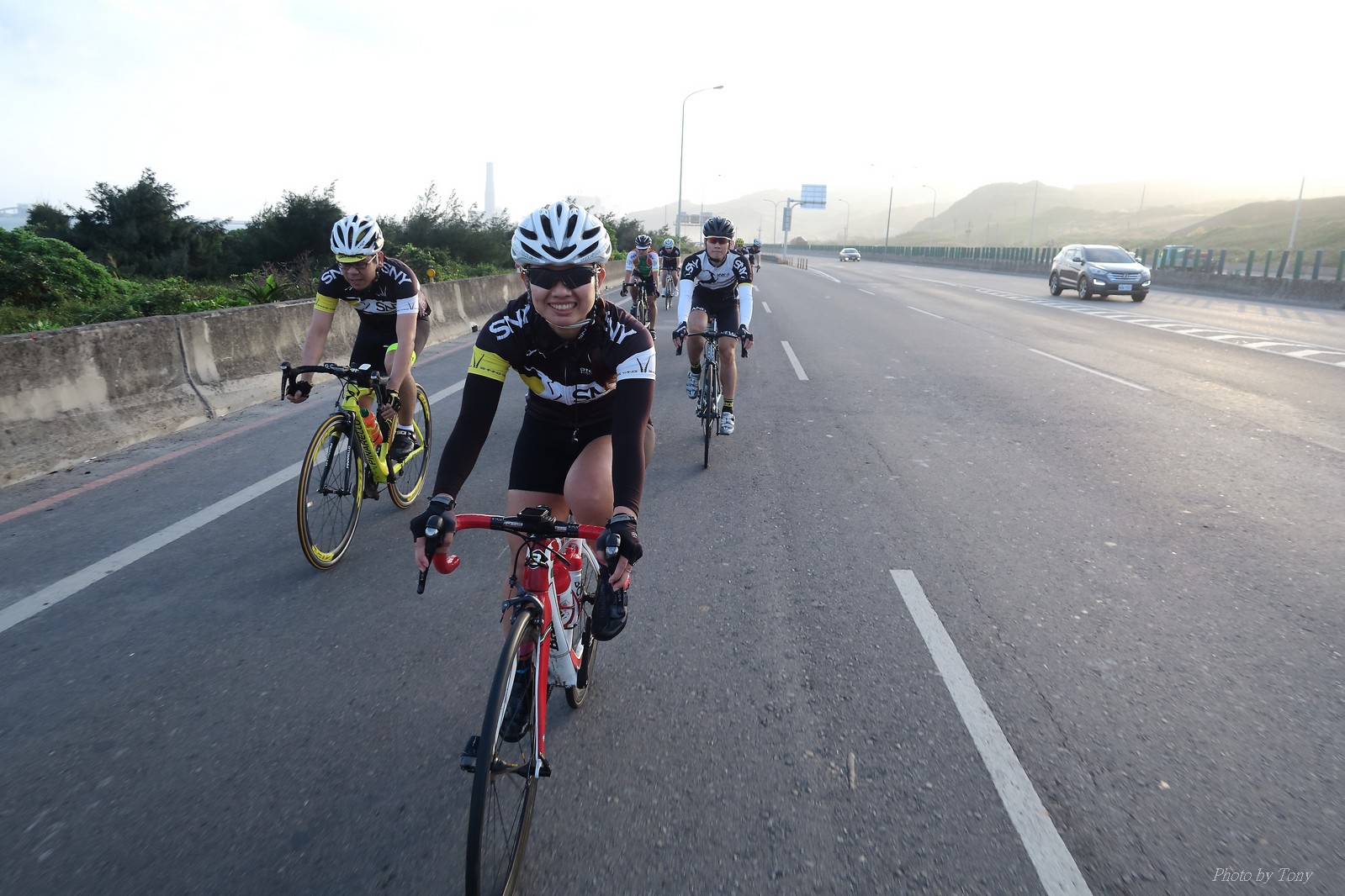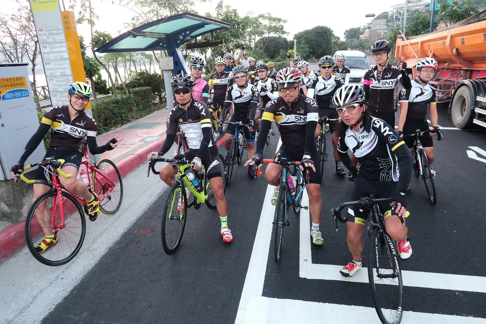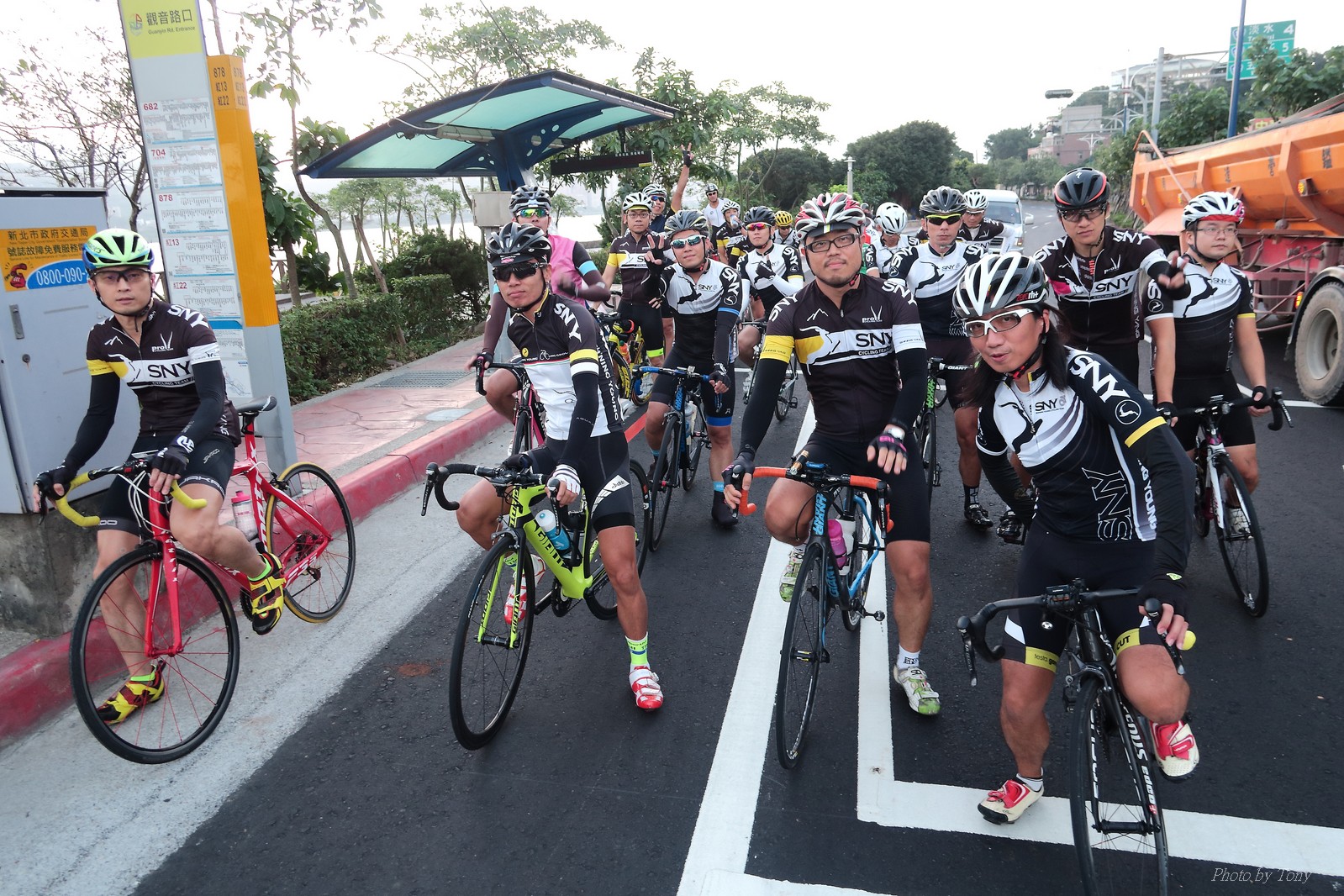 SNY 騎福之旅列車在11/19啟動 一連四天要誠心拜訪台灣9間廟宇 帶著大家的祝福紙條,誠心祈求上天保佑這群熱血的車友 因為體力弱加上上星期也已請過假,這次就報名參加第一天台北到台南的旅程就好 雖然第一天騎西濱再接省道,但人氣也最旺,應該很好玩吧!! 星期四一早不到4點就起床..整裝好出門買個飯糰後趕緊往行天宮集合 好幾位今天沒能一起騎到台南的車友也一起來集合,感覺好溫暖!! 今天的目的地是到台南南鯤鯓,總共300多公里,所以要早早出發(所以我沒和爸媽說要去那騎車,說要去騎去台南,應該會被唸到翻吧XDD) 大夥在黎明天亮前出發... 慢慢騎到八里和另外一團集合 若說去年的北高SNY團是一群精力充沛的高中生,那這次的騎福團真的像是小學生一樣 一進入西濱,二路縱隊馬上乖乖排好..(只有獅王偶有耐不住性子出去奔跑一下:P) 也可能因為是E神和500光在前頭領騎,大家都很乖吧~哈哈!! 今天的風沒有很大..但領頭羊輕輕踩,時速也就30多了 有別於去年sny北高團 今年EASON、光叔、雷射槍清志哥還有麻美都有安裝功率計.. 不用體感,不用心跳也不用時速來控速..,這次都用瓦數來控制強度(用體感,心跳和實際瓦數真的有一段落差!!) 大概就是180-200W來破風領騎 後面只要躲的好,大概只需150W就可以穩穩跟上.. 所以一路跟到新竹算是輕鬆愉快啊~(但是半路到永安就肚子餓了XDD,我明明吃了一個大飯糰啊,趕緊在進新竹前又吃了一大個飯糰!!) 從西濱轉進新竹市,雖路程不遠,但紅綠燈擋個幾次就耗上不少時間 大家在城隍廟拜拜之後,就趕緊上車趕路 所以出了新竹之後,領頭羊將瓦數提高了一些..(雖然我只有騎一天,但實力太弱,只能躲好再躲好XDD) 在進入苗栗好望角前,EASON頻頻回頭問有沒有人知道如何切西瓜避開好望角的上坡,不過沒人回應...知道路的好像都已被放生了XDDD 主團就由500光領軍一路上攻好望角,看著功率計的數值一路往300W衝上去..,媽呀,要這麼殺嗎?? 降降降,降到250W就好,還是逐漸被麻美拉開..,後來看到EASON慢慢退下來,叫大家慢慢騎就好,路還很長,不要在這太衝動..,我再將瓦數降到230W左右.. 一回頭,一群人全擠在我後方..,呃...壓力有點大!! 離頂點最後300公尺,大家按奈不住,紛紛從我身旁噴出去.. 嗯..我要繼續忍住,不差這一點點距離... 待上到頂點再抽車加速衝下坡來追... 這次騎福之旅沒有安排白沙屯媽祖廟,所以整團就直接沒休息繼續往前行 不過後來發現後方幾位車友被放生的有點遠,大家還是決定先暫停休息 等到全員到齊再出發,我叫寶寶趕快往前擠,不然領頭羊紅燈一起步加速,愈後面離愈遠,都要抽車才能追上,會很累.. 不過她說在前面壓力好大..且跟一跟就又慢慢掉隊了!! 老實說寶寶的實力耐力真的不錯,不過要在一群男生裡騎車,還真是辛苦了些!!(蛋蛋怎麼沒有來一起陪一下!!) 且這一段瓦數有時拉的比較高,所以這一段又有幾個人被放生..快到大甲鎮瀾宮前我也快撐不住了..>"<.. 還好就到叉路口了,呼,在崩潰前逃過掉隊的一刧!!(其實瓦數還是沒有拉很高,但就是跟的有點累,最近這一個月都沒有外騎長距離..耐力肌力明顯不足吧!!) 在大甲鎮瀾宮祈福加吃飽喝足後..不知不覺已經休息一個半小時.. 得要加緊趕路了.. 但台一省道上不斷的紅綠燈,騎到讓人快崩潰XDD(一公里可以停個2-3次紅綠燈~) 過了台中之後因為時間比預計慢了2小時,決定不要再騎台一線,要從台19切往西濱去,騎啊騎,不一心又錯過了日盛大哥要和我們會合的追分車站XDD) 後來愈往南部感覺愈來愈順,就決定一路騎台19就好 天色也在進入雲林之後明顯暗了下來.. 大家備好頭燈尾燈,繼續加班往嘉義挺進... 而為了安全起見,雖有體力,但跟不上主團的寶寶還有身體不適的狐狸都被勸上車 進入夜晚,騎起來是很涼很舒服,但因視線不佳的關係,讓我不得不全神貫注的跟車.. 騎起來有心驚驚的感覺XDD 不得不說麻美好有力,一路時速35上下,從彰化把大家帶領到北港,都不會累的,真的好勇猛!!在家插香練功有成!! 晚上7點多,終於抵達北港,離最後一站台南南鯤鯓代天府只剩30公里左右了 呼..快成功了!! 不過...聽說今天住的地方離南鯤鯓還有將近50公里...Orz 媽呀,算算時間,今天至少要加班到10點半以後>"< 再搭朱大哥的車回去..那不就半夜2點了.. 而本來要搭朱大哥回台北的車友有8位 2位沒來..,2位已先行搭高鐵回程!! 連我剩下四位..我提議我們四個先搭高鐵回去 感謝獅王、小游和發哥同意我的任性,都要一起陪我上高鐵..(這樣朱大哥的車也不用再來回跑!!) 離開北港前,自己還特地先繞到朝天宮天拜拜,祈求保佑家人朋友健康平安!! 再和主團說byebye~ 然後最後11km獅王就火力大開,整天下來心跳唯一突破170的就是這了 一整個回家前要把膏用完的概念XDDD 8:36上高鐵,10:00就到台北,一整個飛快!! 且前後輪用大垃圾袋包一包就上車,前後輪都不用拆,真是太方便了!!高鐵真是比台鐵友善太多了,是遠程單車族的好朋友!! 今天感謝SNY大家一路的照顧,雖不圓滿,但大夥平安成功!!:D