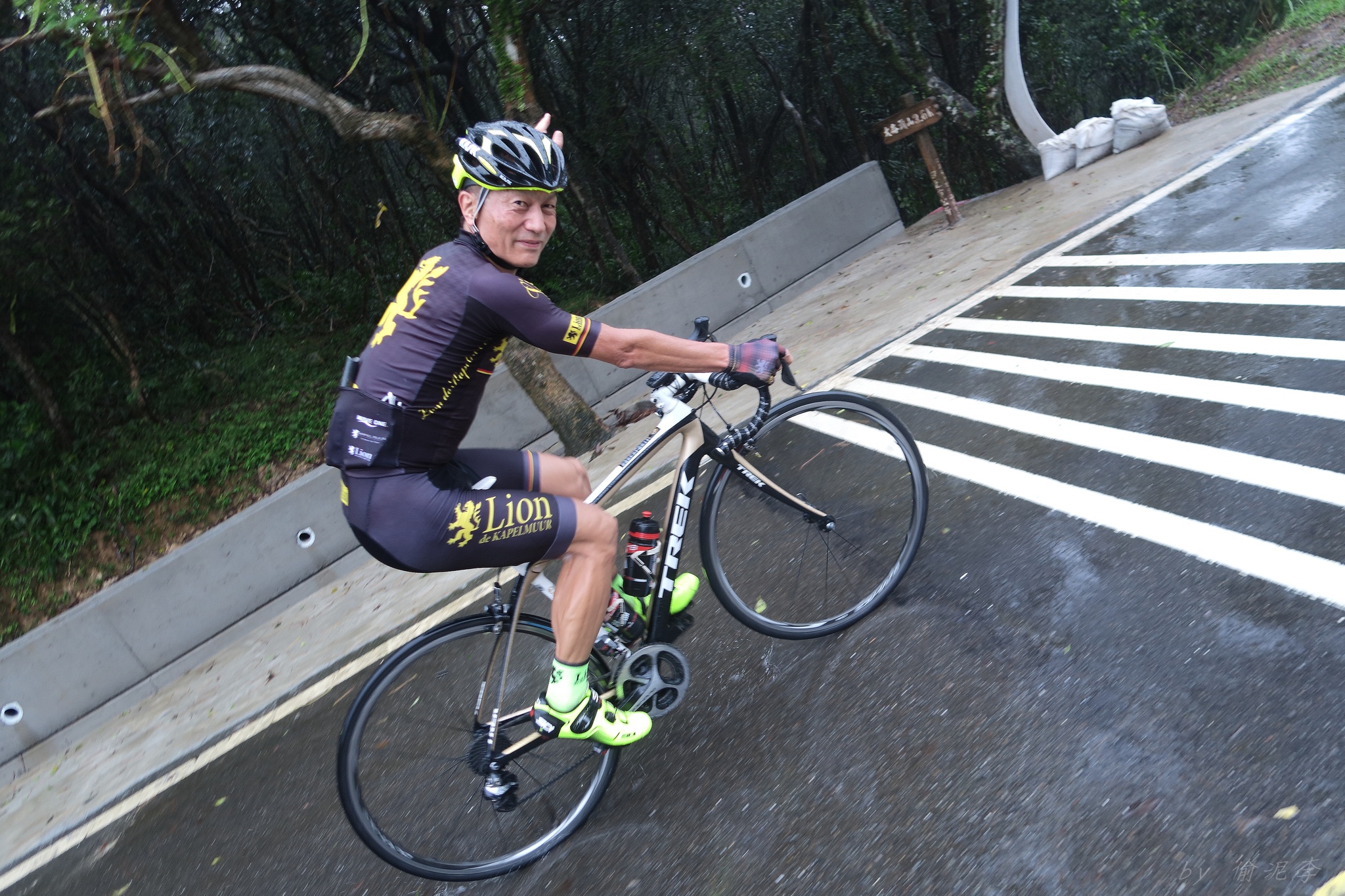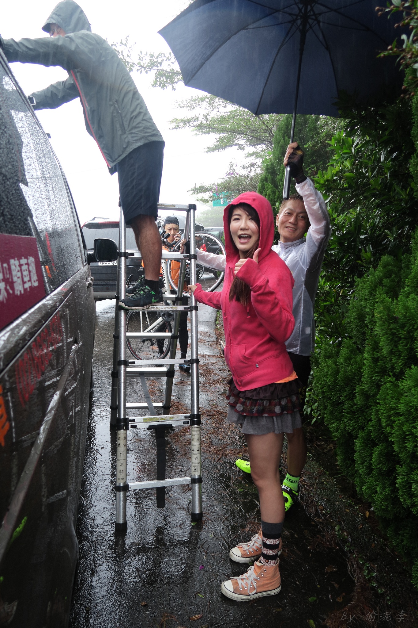 天氣預報說70%下雨~ 但夏美說..風雨無阻!!!風雨無阻!!!風雨無阻!!! 很重要,一定要說三次!! 因為不讓日本女神單摩朗.. 早上雖然地溼,但沒什麼雨,就衝啦~ 沒想到受到號召的車友還不少~ 準備一下,大夥就熱血出發!! 夏美說涼子騎日本富士山有銅環的實力.. 我心想..那不就很快嗎?? 今天又要上演被拉爆的戲碼了嗎??XDD 還好涼子只是來郊遊的,輕鬆騎上山就好~ 只是無指山上真是風大雨大Orz 主辦單位為了車友安全,貼心的請大家上支援車,一起到白石湖的咖啡廳集合~ 感謝KAPELMUUR設想周全!! 而最後本來只有有穿KAPELMUUR車衣的車友有機獲得小帽一頂,在這個風雨交加的日子,社長大方的送給在場每位車友,再次大感謝啊~ 雖然目前還沒有KAPELMUUR的車衣 不過經過這次約騎,我相信會有機會去敗家的:P