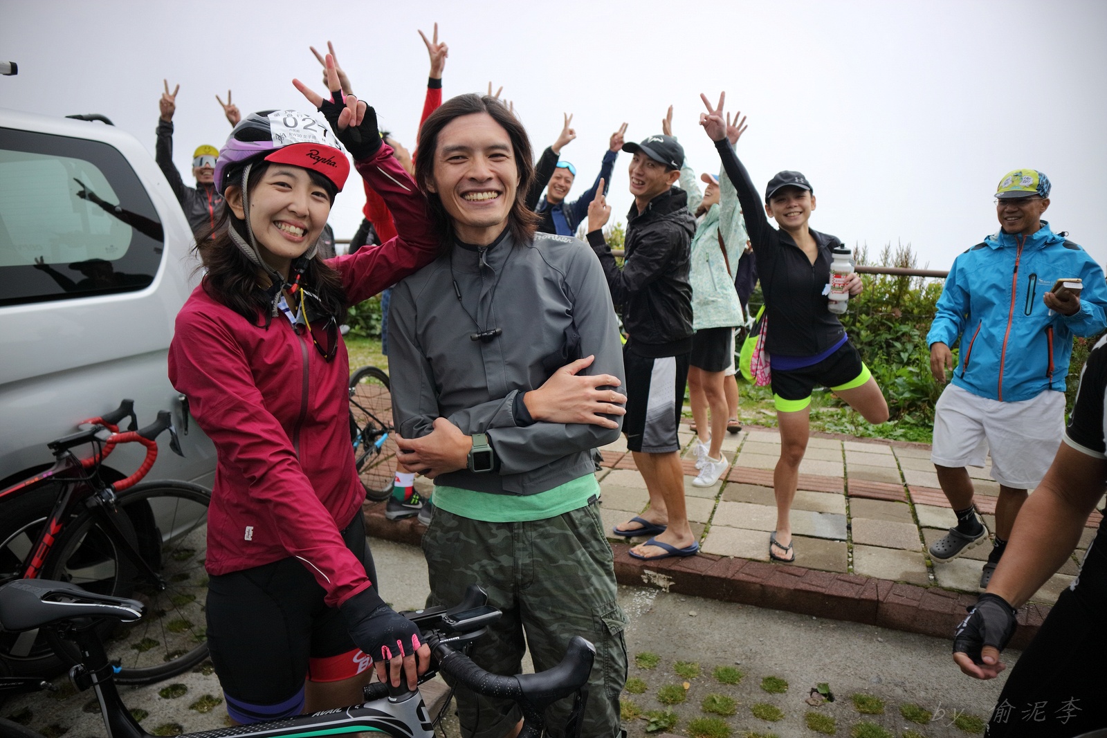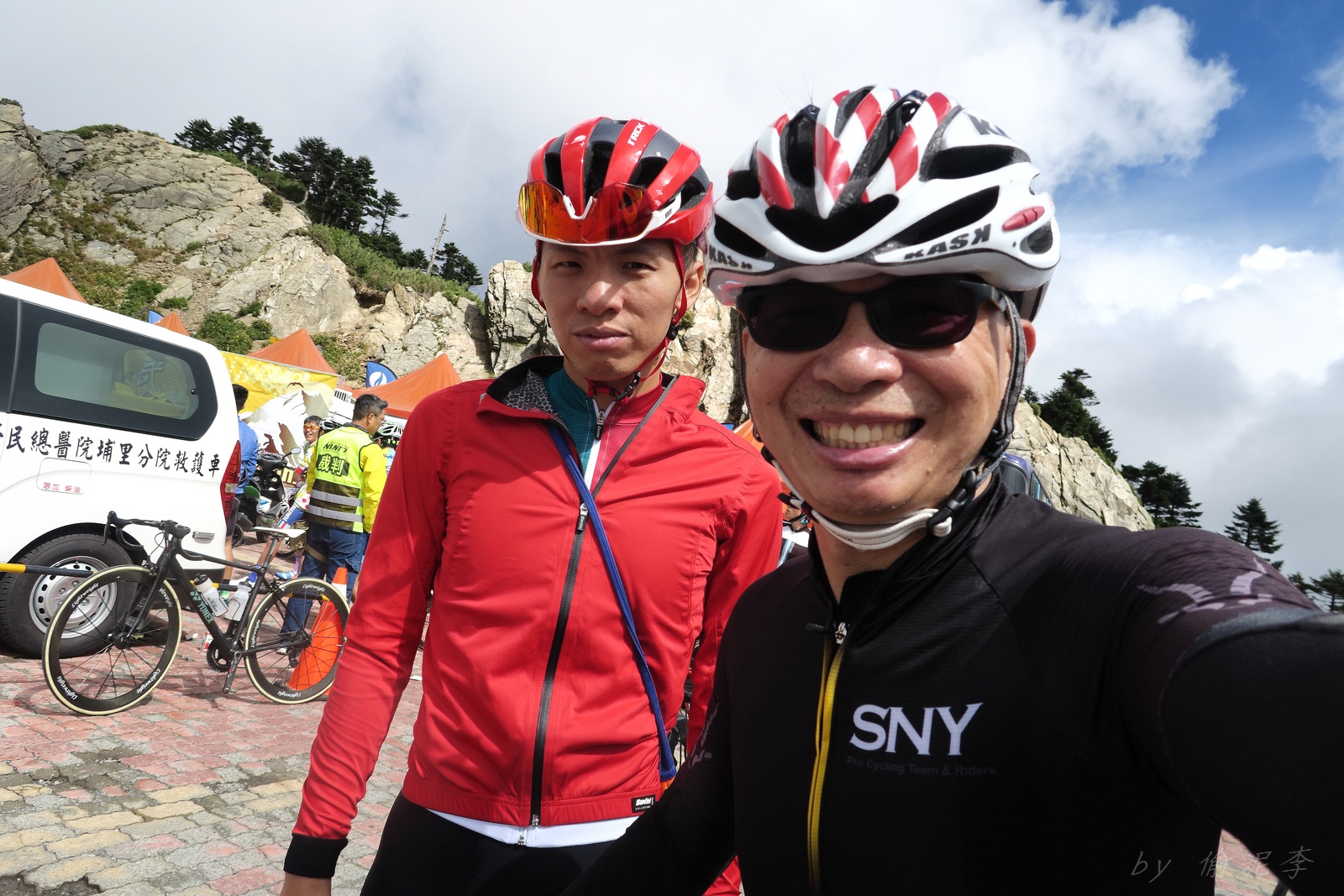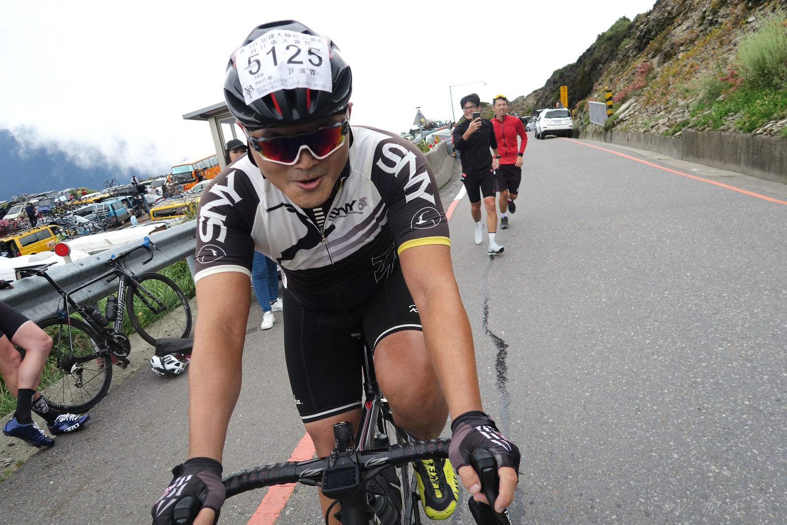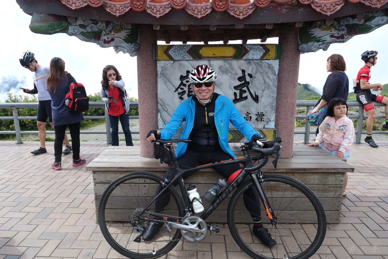 因為SNY的雙進武嶺沒參加到~ 心想最近也有認真在踩ZWIFT~ 就問問EASON武嶺盃補給車還有沒有位置!! 本想是問問..但熱心的EASON馬上訂好飯店和補給車~ 那...不IN都不行了!! 出發前應該先練個2P、3P的行程~ 但...都沒有Orz 大部份只騎1P,在家也頂多踩一小時.. 就這樣..武嶺盃到了!! 出發前還妄想目標430.. 因為算一下推力比,好像2.3就可以了~ 以我的體重,均瓦約150-160就可達成~ 感覺好像不難,但騎起來完全不這麼回事XDD 可能我的表太快樂~霧社前,均瓦約有180,但...時間僅勉強達到430標準而已~ 而前一天因下大雨,忘了把STAGE打開晾乾,這天還騎不到霧社,功率計就罷工沒訊號XDD 沒訊號就靠心跳和體感... 腿沒什麼力,一看到8-10%的坡就用上34T XDD 沒辦法,我是易抽筋體質,還是保守點好~ 出發後就一路沒休息,直到青青草原的隊上補給處..(平常歡樂騎,很少超過一個半小時不休息的,騎的股好痛T__T) 補個水,拍個合照再繼續上路~ 看來今天430無望,但看能不能保5 清淨最高小七到翠峰這一段還算輕鬆,但翠峰到鳶峰就騎到很厭世,騎到腰痠背痛,很久沒覺得自己的核心這麼給力,本想下車休息,但一直騙自己,再騎一點再休息~再騎一點,就慢慢撐到鳶峰了~ 補給一下再上路(感謝大隻推我一把:P) 從鳶峰到昆陽僅有5公里,心想快解脫了,前2.5緩坡一路順暢,心想再來好好拚昆陽後的2.2K天堂路,沒想到後面那2.5K這麼虐心...一路陡坡連發~騎到超級厭世,好想跳車T__T 好不容易撐到昆陽,就剩最後的2.2K 但~武嶺就是看的到,騎不到~ 努力死撐活撐~看著碼表100公尺~100公尺的前進,時速約只有6... 終於在448抵達武嶺~~嗚,好險還有保5.. 下次還是多練點再來~ 但下次還要再這麼自虐嗎??XDD #太天真