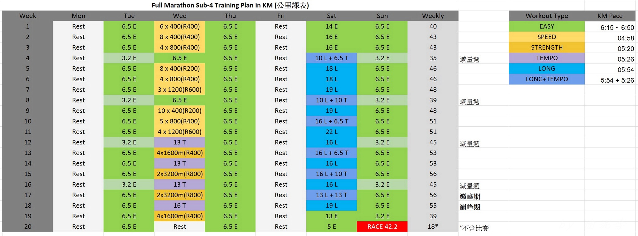 9/1開始針對台北馬拉松開始訓練 到今天為止本月月跑量已突破150KM~算是從我跑步以來月跑量最高的一次 為什麼突然想練跑?就想全馬破4吧~ 前年台北馬連續三個月月跑量都破百..最後4:02,和SUB4擦身而過 有點扼腕 但其實沒破...也不會怎樣啦~ 不過還是算個小小的心願 以往的訓練量都不高所以著重於TEMPO以上的速度跑 即使是假日的LSD跑...也不會慢,依然在TEMPO上下 因為覺得到到時馬拉松比賽時,就是要用略低於TEMPO的速度跑完全程 那平常練習的強度就應該強一些才對 幾年下來發現...這樣的訓練雖不會不好但有氧能力好像不太好.. 即在輕鬆跑的狀態下,心跳依然不會太低或是TEMPO RUN降速之後,心跳不容易跟著降下去 今年我決定改變訓練方式,跑量要加上去.. 9月先好好來EASY RUN打基礎,看能不能讓有氧能力上昇,10月之後再加強速度 不過~~事與願違整個月下來只有幾次EASY RUN 其它只要和朋友一起跑,很容易就被帶到TEMPO去.. 但隨著氣溫下降,且一週幾乎有4-5天的訓練下有氧能力和TEMPO能力感覺都有些提升 但也因為跑量大增,足底和小腿都顯得有些緊繃 平時加強對阿基里斯腱和腓腸肌的按摩 深怕還沒到比賽,自己就先受傷了~ 這週偶爾看到JAY的20週SUB4訓練課表(以前月跑量幾乎不到100,根本用不到任何課表XDD) 一週五天訓練,週跑量約40-50間 感覺和我目前的訓練量有像 再仔細研究一下課表內容,讓我大吃一驚 五天的課表,居然多達三天是EASY RUN 僅有一天的間歇,和一天的LONG RUN 假日LONG RUN要求的速度比馬拉松比賽時配速還慢... 這點顛覆我對訓練的想法 我一直以為平常是要多練習比比賽時的配速還快 比賽時才能游刃有餘的跑 平常LONG RUN也不到馬拉松速(除了有幾週是LONG RUNG+TEMPO) 這樣比賽時可以跑出馬拉松配速嗎??我不禁懷疑 但想想~~這應該是賽前訓練量大,累積很多疲勞所以平時不將速度提高而是著重於EASY RUN,一方面放鬆,一方面提升有氧能力不然還沒到比賽就受傷了~~ 9月初加入雅芬的萌少女跑班每週三的團練也是間歇剛好符合JAY的課表~ 二、五就去大安EASY RUN 假日目前為15-16K的LONG-TEMPO RUN 台北馬還有二個月...,之後的訓練應該會更辛苦些 繼續加油~ 但...先保佑讓我抽中吧!!哈哈~~(去年就沒中XDD) #壞叔叔說之後冬天下雨還要堅持課表才是難的地方 #大模說三個月跑量160_180_200_沒破四都算我贏 #萌少女跑跑班 #大安甩油團 #台北馬加油 #以前覺得月跑量破百很難_其實克服早起就不難 #大模說只要連續21天就可以養成習慣 ---------------------------------------------------------- 後記 「馬拉松的本質就是長跑,逃避長跑的人,就是在逃避馬拉松。」 「Speed 跑 400 操場 120 秒,夠了; Strength 跑 400 操場 130 秒,夠了; Tempo 跑 5:30,夠了; Long 跑 5:54,也夠了。 重點不是你 Speed 能飛出天際跑出 100 秒,而是你每一個 workout 都能老老實實吃下來。面對一個均衡完整的初階課表,如果你哪一項特別辛苦,那就代表那是你的弱點,集中精力攻破它。而不是只看自己的強項」 就是在說我XDD 也解答我的疑惑 https://www.facebook.com/sub3jay/photos/a.2050746604948971/2334837439873218/?type=1&theater&hc_location=ufi -------------------------------------------------------------- 測3000公尺心得 9/25這天要測試3000公尺 平常要跑間歇跑耐力跑我都不會緊張 但一要測驗,我就會緊張 心跳有加速,自己都感覺的到 緩跑10分鐘的心跳比平常都還快 但等站到起跑線上,一起跑就忘了緊張的感覺 3000公尺是7圈半 若想要13分內要配4"20以內~ 目前的實力好像還不足,保守點以13"30為目標(400一圈約為110秒) 這次決定跳組直接跟上亞辰和瑞瑞,當然倢如也一起 我不知道他們要配多少,但我先努力跟上 半圈先壓錶後,還有7圈 第一圈為104秒 亞辰太快了 我腦袋還來不及換算跑速 第二圈降為110秒 這速度對我來說還不錯 有點累又不會太累,應該可以撐完7圈 但也無暇顧及後面的倢如了 再來第3第4圈為108秒 還剩3圈,1.2KM~ 我盤算著還有多少力氣要做最後的衝刺 第5圈112秒,心跳已快180,我決定第7圈再衝刺 第6圈112秒,一過第6圈 我速度加快,超過亞辰和瑞瑞(不好意思跟跑那麼久,最後超過他們~) 最後100M已經覺得吃力 第7圈95秒 努力撐完...13"18秒 差不多是預期中的成績~ 感謝亞辰和瑞瑞的領跑 沒有他們,我應該會跑的很辛苦!!感謝~~