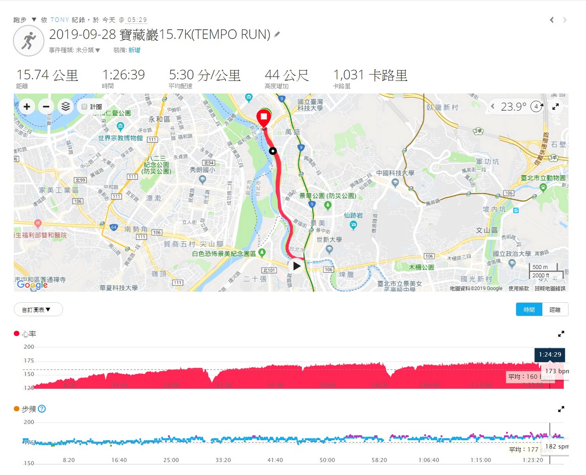 瘋雨無阻發大財啊~XDD 約5點福和橋下集合 4點半起床看雨勢不大 趕緊去刷牙洗臉準備一下 一回來...怎麼雨是澕啦澕啦的下.. 群組上..詢問一下大家 果然都說下了大雨 不過倢如說她們已經在計程車上.. 原以為她們會掉頭回家 結果沒有.. 好吧~「跑者是防水的」,衝吧~~ 1 06:00.8 06:00.8 06:00.8 1 2 05:40.9 11:42 05:40.9 1 3 05:42.5 17:24 05:42 1 4 05:25.7 22:50 05:25.7 1 5 05:04.4 27:54:00 05:04 1 6 01:14.0 29:08:00 01:14 0.23 7 01:04.0 30:12:00 00:27 0.05 8 05:16.2 35:29:00 05:16.2 1 9 05:11.5 40:40:00 05:11 1 10 05:23.1 46:03:00 05:18 1 11 05:14.2 51:17:00 05:14.2 1 12 05:10.8 56:28:00 05:10 1 13 01:10.6 57:39:00 01:10.6 0.21 14 01:06.9 58:46:00 00:32 0.04 15 05:18.5 01:04:04 05:18 1 16 05:22.2 01:09:26 05:22.2 1 17 05:20.4 01:14:47 05:20 1 18 05:20.2 01:20:07 05:20 1 19 05:21.8 01:25:29 05:21.8 1 20 01:10.6 01:26:39 01:10.6 0.21 福和橋來回景美橋約5k多一點 一趟就喝水小休一次 15.7k含休息均速約5"30,不含休息約5"25 因為7點還要去台大麥當勞和筱嵐姐集合,就沒再繼續 不然這週課表應該要跑18-20k左右 不過,第三趟就覺得開始累了 均速約5"20,心跳在171-175間 表示有吃力~ 這個月下來的訓練,應該是有累了XDD #天好黑 #妹好強 #用生命跟跑 #萌少女跑跑班