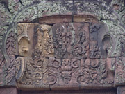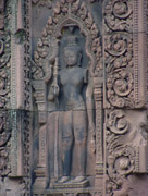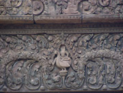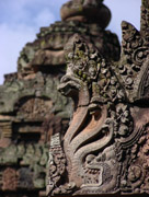 12/02 ~~女皇宮,吳哥遺址的瑰寶~~ 今天的重點行程是女皇宮,所以得早半小時出門。今天也換成20人座的小巴出遊。結果呢??沒有比toyota 的驕車來得舒服!!去的路況並不是很好,一開始還可以沿途欣賞沿途的田野風光,但坐到後來真是有點不耐煩@@,而且希望女皇宮如傳言中漂亮,不然就....。車子開了一個小時終於到了女皇宮。下車不到10分鐘後,我就確定這趟車程是值得的啦,而且沒來一定會後悔。我們還在前面留戀的時侯,導遊阿姨就催促我們先到後方的主廟去看看,因為會愈來愈多人~~,果然,沒多久,小小的地方陸陸續績一直湧進觀光客,幸好我先照了許多相片,不然畫面上就會出現許多路人甲乙丙丁....。但遺憾的是目前主廟正在維修中,不能太靠近,真是太可惜了。不過想想也許以後為了維護古蹟,開放的範圍可能會愈來愈少了,我們現在來還是算是很幸運的吧!! 看看女皇宮的雕刻,再想想之前的浮雕。女皇宮真的是精細許多。幸好女皇宮是排在最後面參觀,不然對其它的浮雕可能就會興趣缺缺了!! 再來是前往Banteay Samre,這是剛好前一天看到網友戚振中的行程中有規畫,就請導遊帶我們去。導遊阿姨說她也好久沒去這了,因為之前的路況一直很不好,車子無法進去,得換機車才行。果然我們一開進通往Banteay
